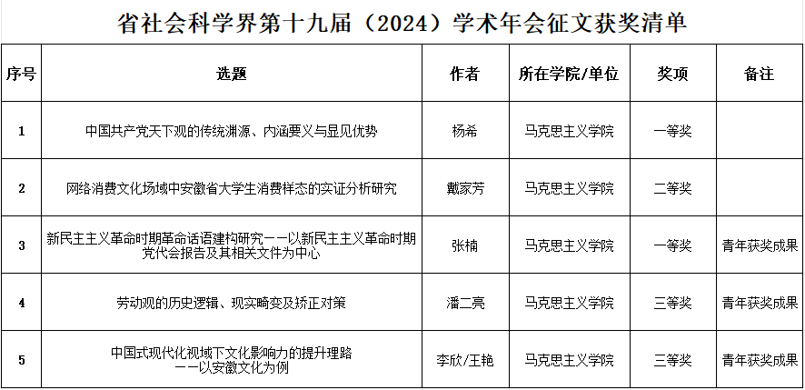 近日,安徽省社会科学界联合会公布安徽省社科界第十九届(2024)学术年会征文获奖成果名单。公司师生共有5篇论文获奖,其中一等奖2项,二等奖1项,三等奖2项,获奖数位居公司首位。