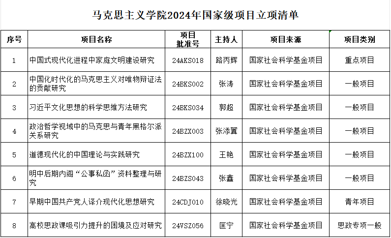 随着日前国家社科基金高校思想政治理论课研究专项立项名单正式公布,公司申报2024年各类国家社科基金项目的工作也正式结束。本年度公司教师共计获批立项国社科项目8项,立项数再创新高。具体立项情况如下: