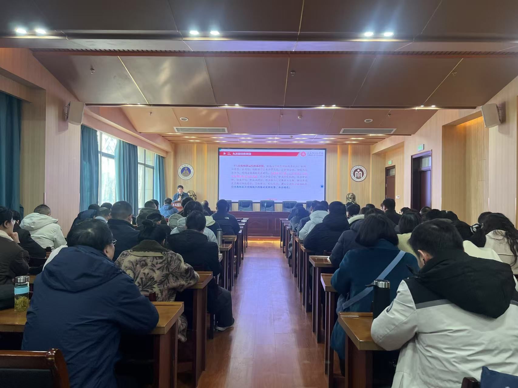 党委书记严宏对《纲要》总体要求、重点任务等方面进行了详细介绍,并联系工作实际深入解读了《纲要》部署的九方面任务措施。教职工们全神贯注,认真记录,深刻领会《纲要》中关于教育优先发展、深化教育改革、加强教师队伍建设、提升教育质量等重要内容。