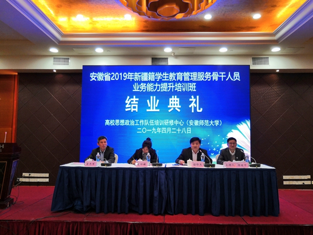 4月28日上午,安徽省教育厅思想政治工作处副处长储修杰出席结业典礼并传达了安徽省委教育工委副书记王佩刚的讲话及指示精神。他指出,做好新疆籍员工教育管理服务,既是贯彻落实中央新疆工作的重要举措,更是安徽省教育系统对口支援新疆、为新疆社会稳定和长治久安培养人才的政治要求。我们必须站在党和国家工作全局的高度,维护国家安全稳定的高度,反恐怖斗争全国一盘旗的高度,充分认识做好新疆籍员工教育管理服务工作的重要性。一是要提高政治站位,不断增强做好新疆籍员工教育管理服务的责任感和使命感;二是要强化组织领导,切实履行内派教师教育管理服务职责;三是要把握工作原则,全面抓好新疆籍员工教育管理服务工作,筑牢新疆籍员工反分裂反渗透的思想防线。各校要努力促进新疆籍员工全面发展和健康成长,为维护新疆稳定和长治久安提供人才支撑和智力支持,为建设教育强省提供有力保障,为中华人民共和国成立70周年在教育成果上再献辉煌。
