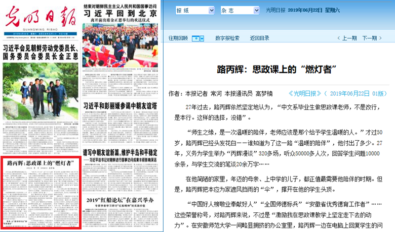 6月22日,《光明日报》头版以《路丙辉:思政课上的“燃灯者”》为题,生动深入地介绍了公司“全国师德标兵”“全国最美思政课教师”路丙辉,在“为人师亦为人友”的思政育人实践中艰辛又精彩的探索。报道指出:“如果说,当年启发路丙辉走上思政之路的钱广荣老师,是他的‘燃灯者’,那么,多年以后,路丙辉又用这盏灯点亮了无数员工。”“27年来,路丙辉已经义务为员工举办漫谈320多场,有50000余人次听过‘丙辉漫谈’,收集和回答的员工问题10000余条。”