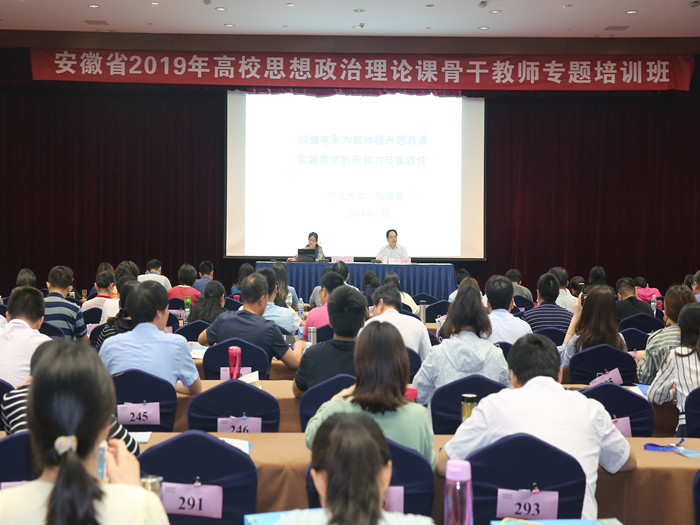 本网讯(安徽省高校思想政治理论课教师培训基地)7月13日上午,由中共安徽省委教育工委主办,安徽省高校思想政治理论课教师培训基地(beet365官方网站)承办的安徽省2019年高校思想政治理论课骨干教师专题培训班邀请到河北大学beet365教授、硕士生导师陈海英讲解“以微电影为载体提升思政课实践教学的亲和力与实效性”专题,由公司beet365副经理、教授、博士生导师姚宏志主持,来自全省各高校的400名思政课教师参加了本次专题课程培训。