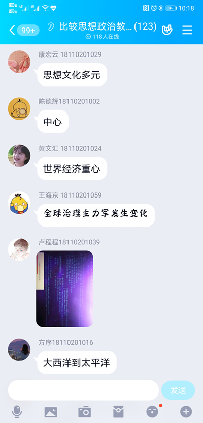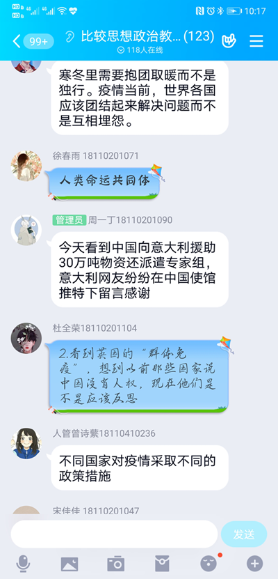 《比较思想政治教育》为思想政治教育专业2018年版人才培养方案新设课程,课程性质为专业必修课。该课程具有学科交融多、内容涵盖广、教学对象专业背景复杂等特点,教学难度较大。杨希老师自承担教学任务后,投入了很大的精力研究学情和教情,不断探索教学设计。本次观摩课的授课内容为第一章《当代世界比较思想政治教育概述》,杨老师主要讲解了“当代世界思想政治教育的历史发展问题”这一重点内容。授课过程中,杨老师密切结合本次突发疫情以及线上教学等诸多挑战,融入相关案例帮助员工理解不同背景下的思想政治教育元素,从比较思想政治教育的视角,引导员工思考各国不同防疫政策背后的深层因由。本次观摩课具有两个鲜明特点:一方面,杨老师在前期课程建设的基础上,做了打磨课程的精心准备,将国内外疫情发展、各国防疫情况全面融入课程体系,扩充为引导员工学习、思考国(境)外思想政治教育的鲜活素材;另一方面,杨老师灵活采用了线上教学互动的各种可操作性方法,形成了“QQ群”直播授课、“群聊”课上互动、“学习通”作业巩固、定期了解反馈等一整套线上教学模式。线上教学监控情况显示,选课员工对于该课程满意度较高,认为课程内容紧密关照疫情、教师授课与“群聊”互动同“屏”共振、课后作业有效且有趣等。