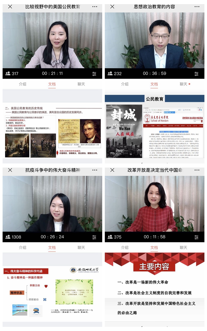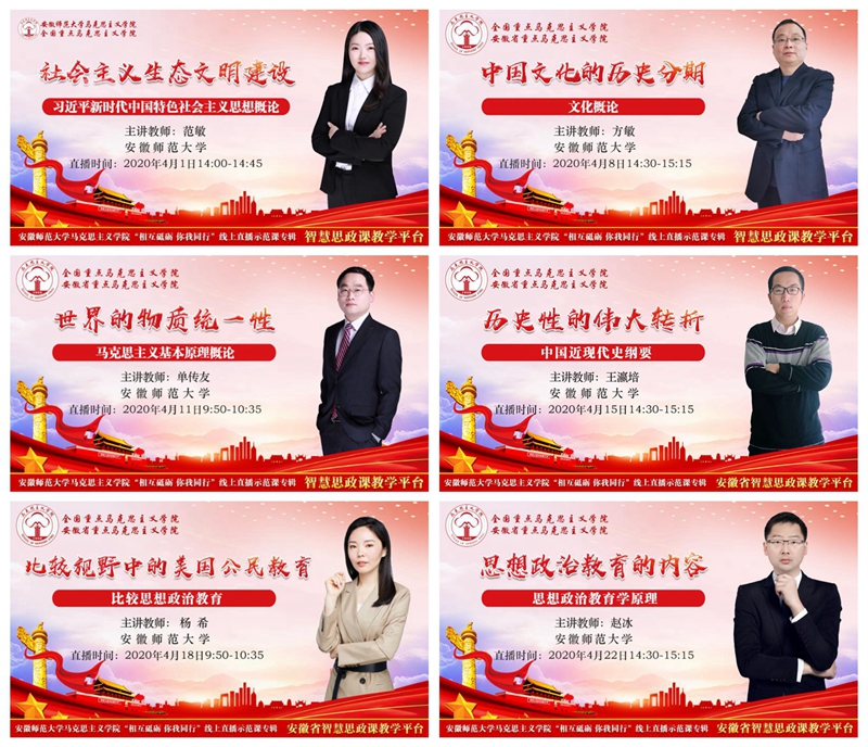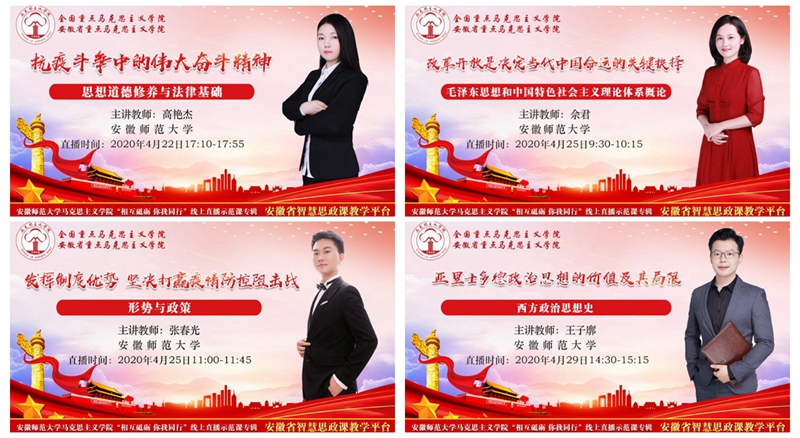 在公司领导的科学指导、全院师生的共同努力下,此次活动顺利落下帷幕,整个活动为全校建好线上课堂起到了很好的引领作用。安徽省委教育工委思政处已经将本次专辑纳入安徽智慧思政平台资源,公司教务处及时在校园网发布10个直播示范课开课信息并将授课内容纳入beet365官方网站赭麓学堂“热门课程”—beet365上直播示范课专辑(链接地址http://ahnu.gj.chaoxing.com/portal/courseweb/14835361.html)。