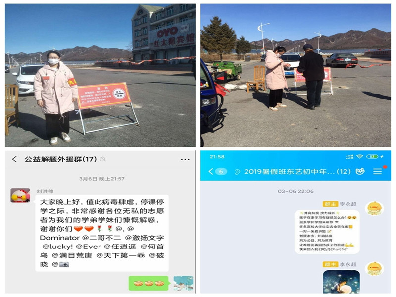 沧海横流显英雄本色,最是危难见真诚初心。在内蒙古乌兰察布市集宁区泉山街道察哈尔社区,实践团队宣讲员郑渊义不容辞加入战“疫”志愿者的队伍。他带着红袖章,穿梭在社区的每个角落,负责入户走访,为出入人员扫码测体温,为进出车辆登记信息。无独有偶,团队宣传员郑雨嫣在得知家乡安徽省合肥市肥西县三河镇二龙社区招募志愿者时,毫不犹豫的加入其中,严格落实疫情防控的各项措施,为小区居民登记出入信息、测量体温、发放通行证。团队宣传员薛艳茹同样坚守在辽宁省大连市庄河市仙人洞镇的防疫岗位上,她用足够的耐心劝返外来人员,帮助他们消除焦虑,化解质疑。除了线下抗“疫”,团队副队长李永超积极加入到公益外援解题活动中,为防疫在家的中小员工进行线上解题辅导。疫情面前,团队成员用青春坚守初心,在全国各地发光发热,点滴奉献汇聚成打赢疫情防控阻击战的磅礴力量。