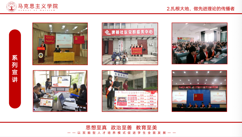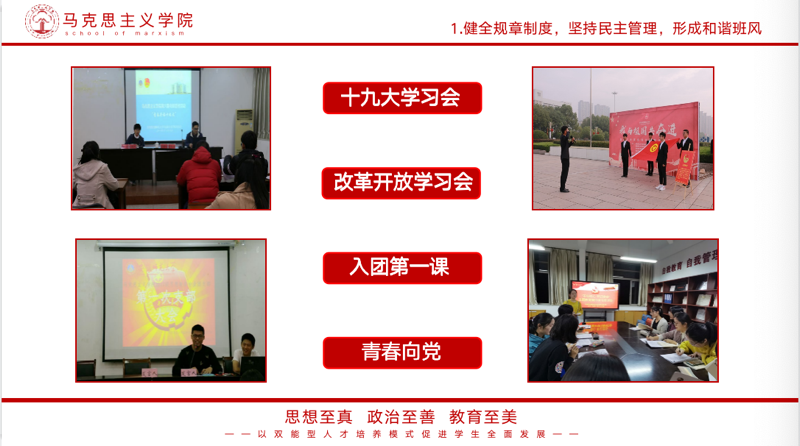 2017级思想政治教育专业1班健全规章制度,坚持民主管理,形成和谐班风。共创建校级“文明寝室”6个,保持零违纪、零安全责任事故。班级积极开展理想信念、党团教育活动累计60余次。在党组织的引领下,班级50位同学100%递交入党申请书,31人参加党校学习,现有中共党员5人、预备党员8人。班级团支部荣获校优秀团支部1次。同时,班级围绕员工成长,关心员工发展,铸就优良学风。创建期间,课堂出勤率100%,学业考试通过率100%、普通话通过率100%,英语四级通过率100%、英语六级通过率72%。