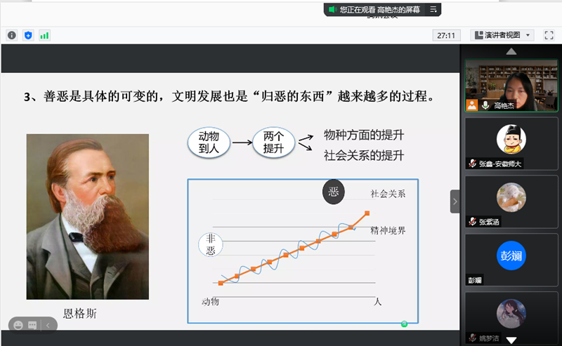 线上教学展示结束后,部分观摩老师还进行了线上交流探讨。老师们认为,高老师的《思想道德修养与法律基础》公开课备课充分、理论深刻、逻辑清晰、语言精炼、内容丰富;注重问题导向,对“共产主义是虚无缥缈的吗?”这个重难点问题做了系统深入的分析,能够解答员工对于共产主义远大理想的疑惑,引领员工树立远大理想,坚定理想信念,是一场非常成功的线上观摩课教学。