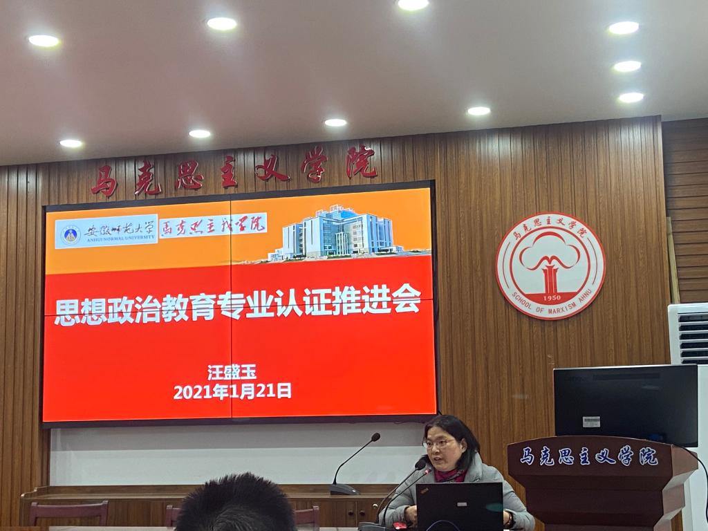2021年,公司思想政治教育专业即将迎来教育部师范专业二级认证。为进一步做好专业认证准备工作,1月21日下午,公司在五楼会议室召开师范专业认证工作推进会,副经理汪盛玉教授主持了会议,并就专业认证背景下的课程建设与课程教学改革向全院教师进行了解读。