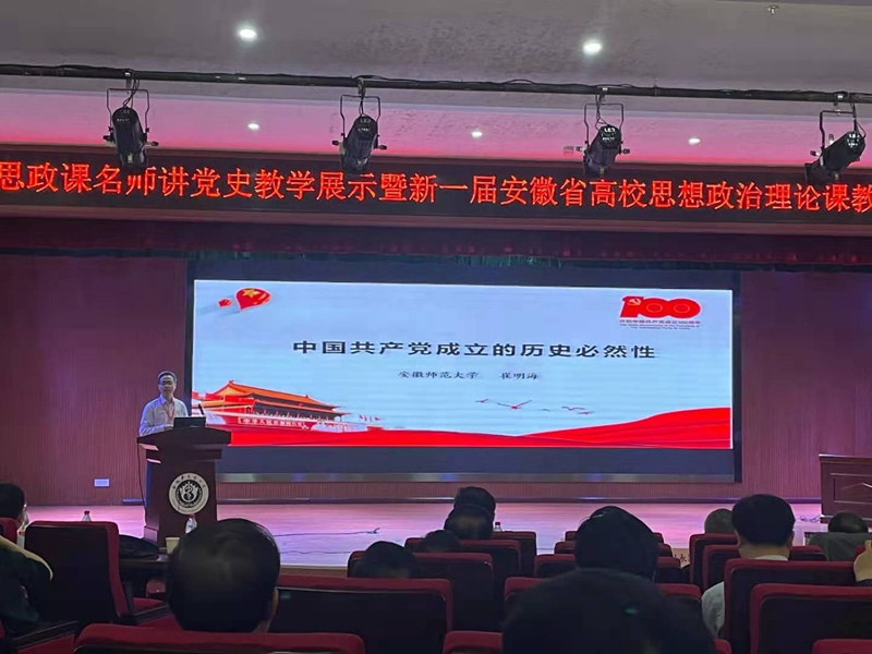 会议期间,举行了教指委代表授聘仪式,并采取线上线下相结合、全程现场直播方式进行全省高校思政课名师讲党史教学展示活动。合肥工业大学beet365钱斌教授、淮南师范大学beet365吴玉才和beet365崔明海副教授等五位思政课教师进行讲党史教学展示,全省高校广大思政课教师和员工通过云端学习观摩。公司教师崔明海以“中国共产党成立的历史必然性”为题进行了教学展示,获得了同行的好评。