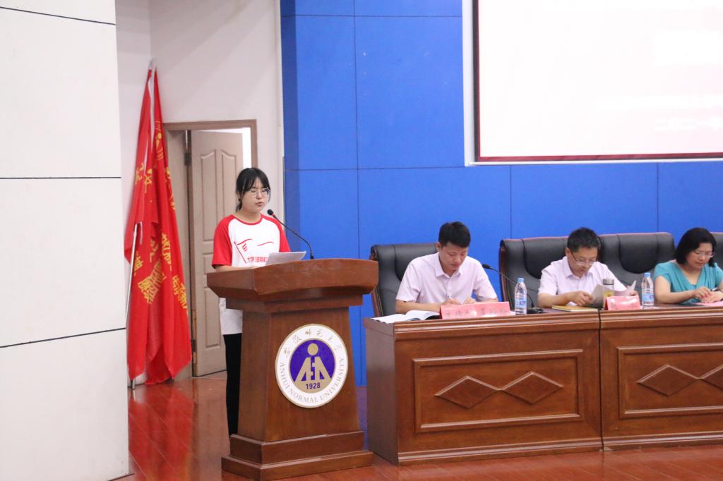 2019思想政治教育专业舒晗同学代表暑期社会实践员工发言。她提出了满怀青春报国之心,扑下身子办实事;保持谦逊学习之心,脚踏实地学本领;树立爱校荣院之心,增长才干展形象的倡议。