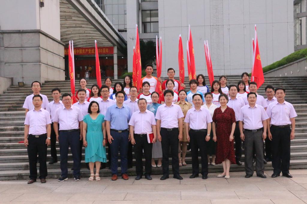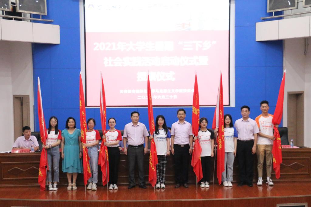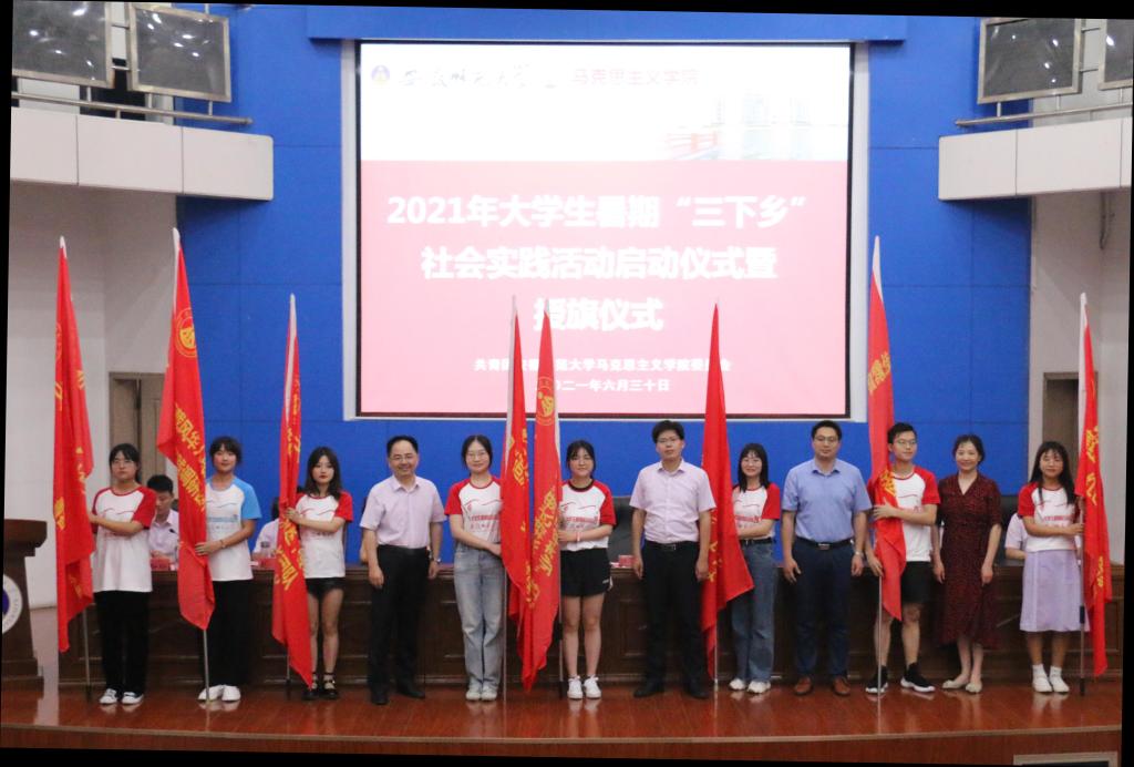 廖仲明、严宏、姚宏志为暑期社会实践团队指导教师颁发聘书;廖仲明、严宏、姚宏志、刘玉艳为校级重点团队授旗;汪盛玉、李祥兴、赵冰、余本玉为院级重点团队授旗;与会领导老师与社会实践志愿者合影留念。