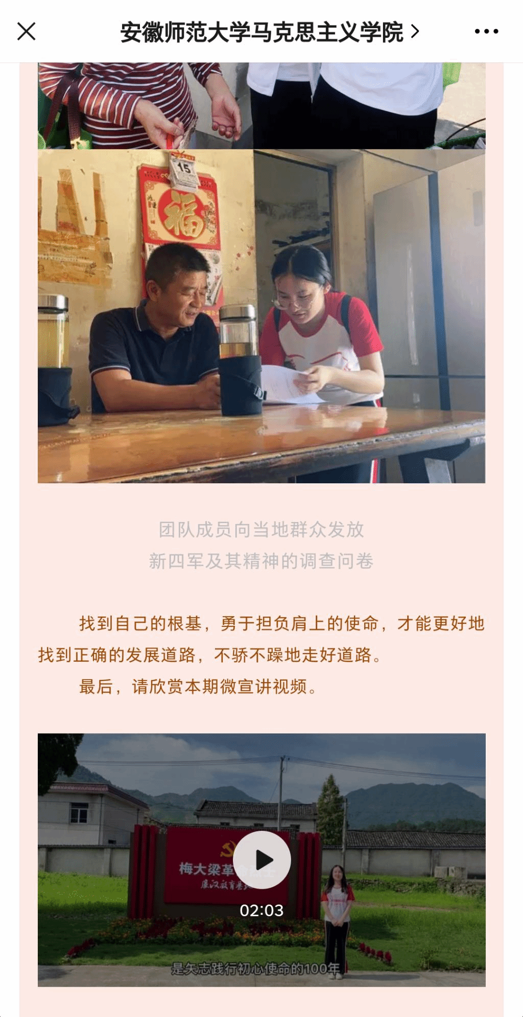 通过专题式宣讲,各宣讲团队根据实践地点的不同制定专门的宣讲计划,坚持先读地方党史、深入基层调研,再开展宣讲,变“说教式”为“共鸣式”,特别注意改变“一人讲、大家听、满堂灌”的“说教”,用群众语言阐述深刻的道理,做到台上宣讲,台下“共鸣”。7月16日,beet365赴泾县“传播红色文化,赓续红色基因”宣讲调研团队经调研兵探寻走访了三位抗战老兵后在泾川镇城东社区开展了以“泾县典型英雄人物故事”为主题的理论宣讲活动,并以《我和我的祖国》将此次宣讲活动推向了高潮,引起了听众共鸣和跟唱。