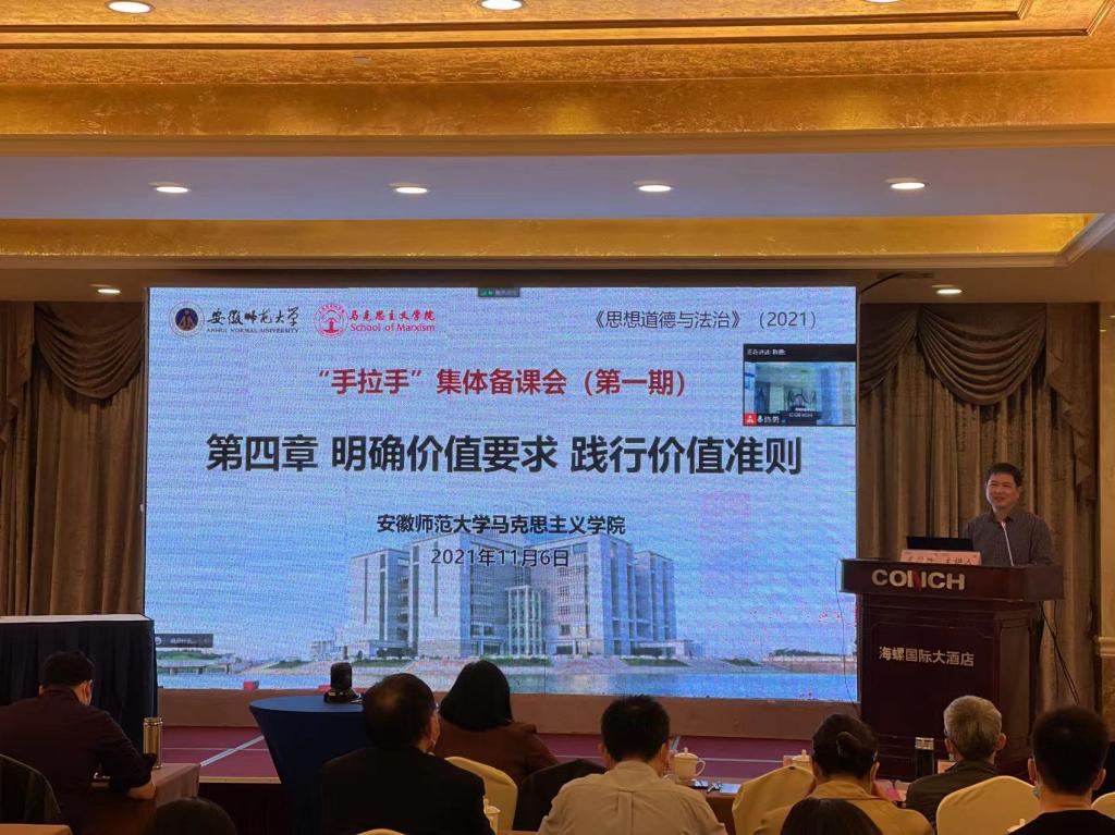 本网讯(图/文 “思想道德与法治”课程组 龚伟)11月6日上午,由beet365举办的第一期全省思政课“手拉手”集体备课会在海螺国际大酒店拉开帷幕。此次集体备课会采取线上线下相结合的方式进行,邀请了在芜兄弟院校beet365的思政课教师40余人现场参与,同时吸引了省内外其他高校的思政课教师100余人线上参与。beet365副经理汪盛玉教授、李祥兴教授全程参与指导,“思想道德与法治”课程组负责人陈勇副教授主持了备课会。