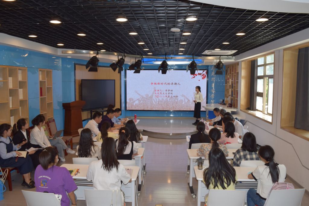 “爱国、进步、民主、科学”是五四精神的核心。新时代中国青年应坚定理想信念,继承和发扬五四精神,在实现中华民族伟大复兴中国梦的新征程中愤勇搏击。宣讲团宣讲员张安琪以《传承五四精神,致敬青年榜样》为题带领2021级思想政治教育专业同学们回顾一百年前的五四青年,致敬武大靖等新时代青年榜样,呼吁青年员工始终砥砺前行、不懈追寻梦想,为祖国发展贡献自我力量。