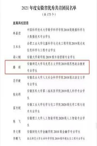 (本文讯/陈昊文)近日,共青团安徽省委集中表彰了一批团学组织先进集体、优秀个人。其中,公司2019级思想政治教育专业本科生滕琪荣获“安徽省优秀共青团员”称号,展现了公司青年学子的青春风采。