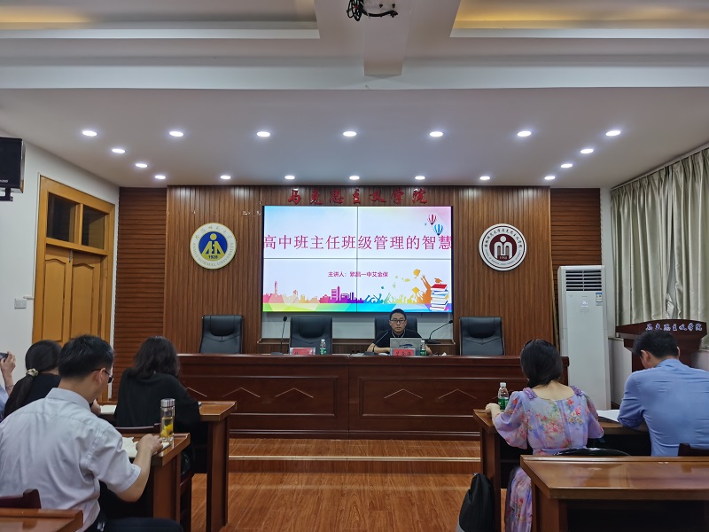 艾金保老师以“高中班主任班级管理的智慧”为题,从“班主任工作分析”“我的治班办法”“我的建议”三个方面为同学们日后的班主任工作指明了方向,并以亲身经历告诉同学们治理班级的“五要”之道,引发了在座同学对高中班主任工作的强烈兴趣。