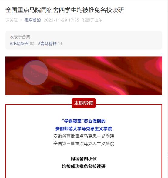 2022年11月21日,新安晚报推送文章《“学霸寝室”怎么做到的?安师大同宿舍四小伙均被成功推免名校读研》,报道公司219寝室四位男生集体保研的优秀事迹。该寝室优秀事迹已被安徽网、新安晚报、大江资讯等多家媒体相继报道。