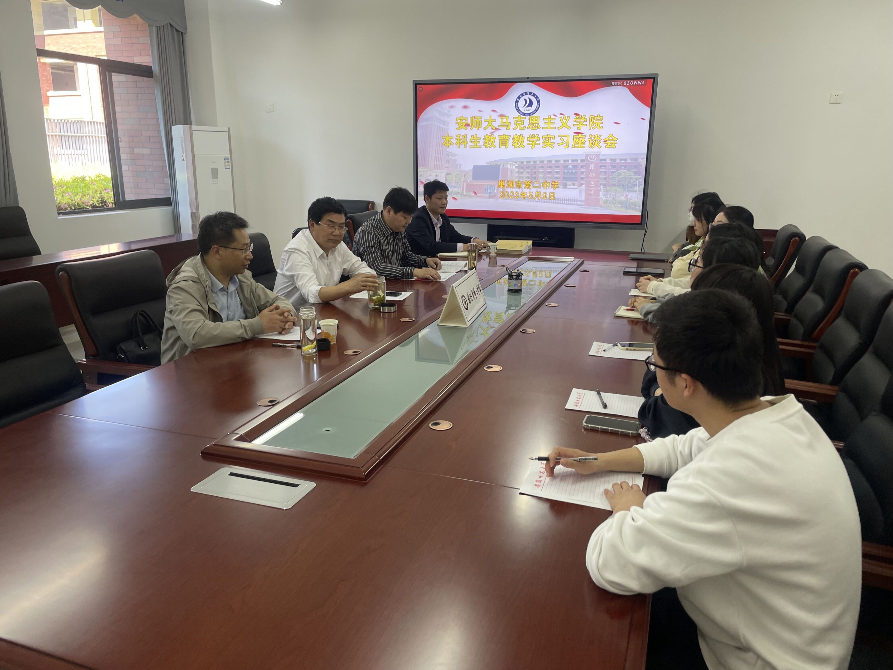 巢湖二中副董事长李远静、教务处主任李华、高二年级部主任陈俊、高一年级政治指导老师宋必胜热情地接待了两位领导老师。座谈会上,李远静董事长简要介绍了巢湖二中新校区的办学规模、公司环境等概况以及此次实习的工作安排,陈俊主任和宋必胜老师分别介绍了实习生在校实习期间的总体表现,并对实习生们给予高度评价和充分肯定。随后实习生分别从教学工作、班主任工作以及与员工的相处等方面向学院领导老师汇报了两个月来自己的感悟与收获,提出了困惑,反省了不足。公司领导老师针对实习情况以及存在问题进行了深入的沟通交流,对同学们在实习中遇到的问题进行了耐心解答和专业指导。赵冰副经理强调,实习是我们一生中最特别的从教体验,要珍惜机会锻炼自己的才干,全方位提升自己。辅导员夏盼盼老师则叮嘱实习生们在最后的时间里,仍然要严格遵守实习公司的各项纪律,时刻注意安全问题,为实习工作画上圆满的句号。