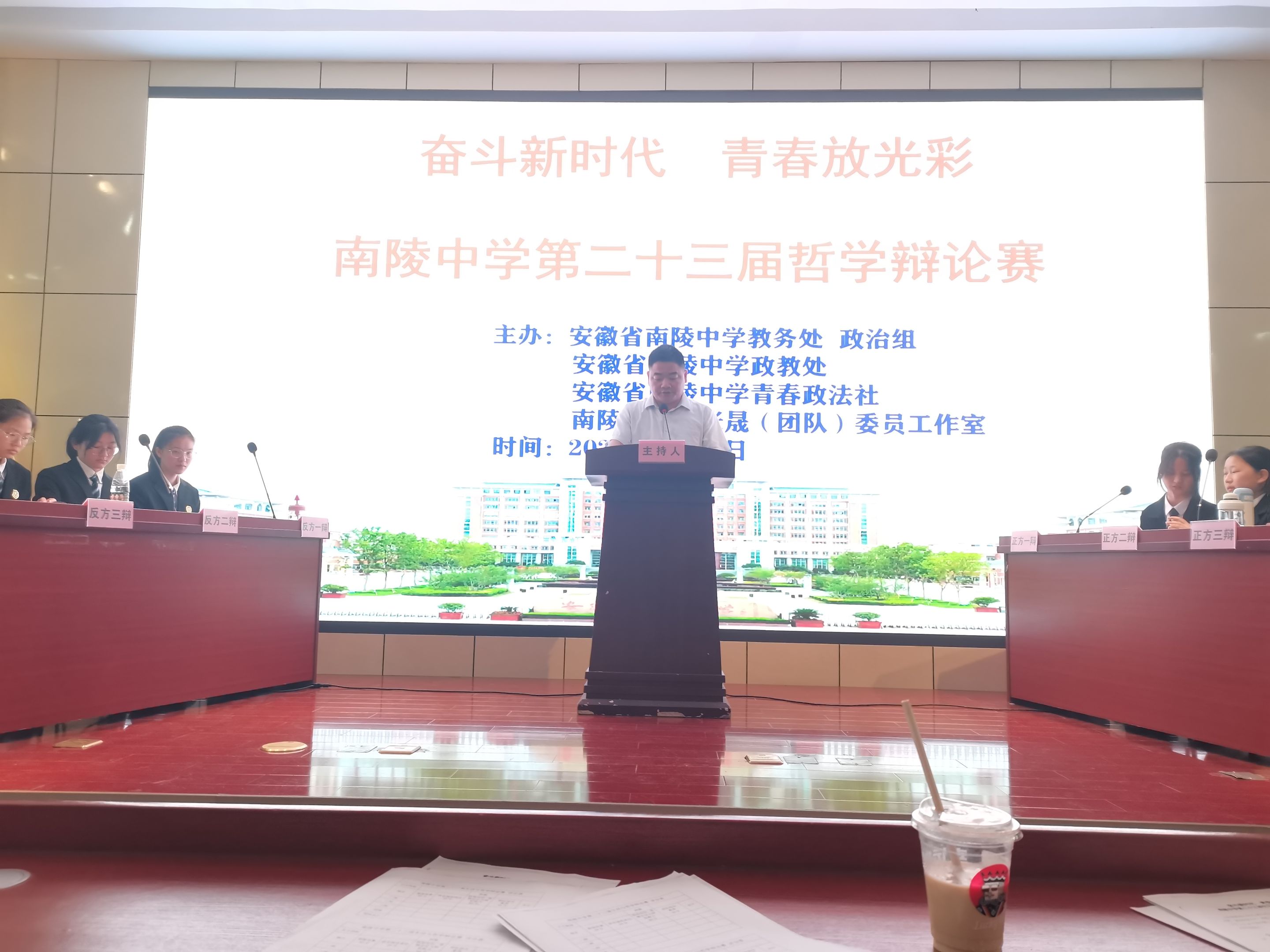 本网讯(文/摄 马雅芸、汪琪)为提高员工综合素质,促进员工全面发展,建设校园文化,根据安徽省南陵中学教学教研计划安排,南陵中学于5月17日下午在综合楼会议室举办“南陵中学第二十三届生活与哲学辩论赛”,高二7个文科班共4支队伍参与比赛,赴南陵中学实习小组成员钱欣彤、叶雨涵、王灏、陈德伟以及马雅芸5人担任评委,高二年级组实习生方乙婷、王璇、汪琪、苗艺璇参与指导。在实习小组的参与协办下,本次辩论赛获得圆满成功。
