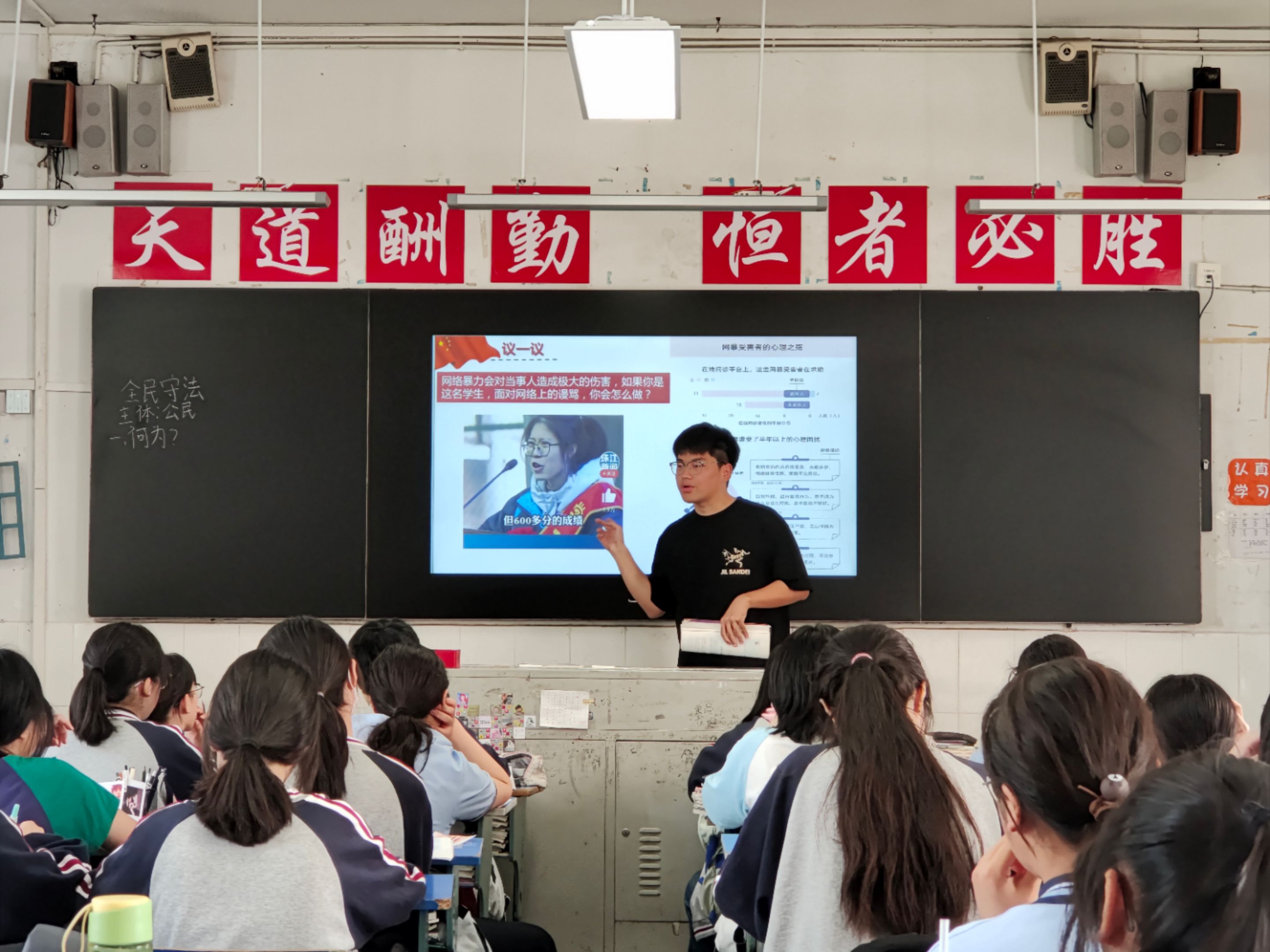 实习生李涵、陈芳玥分别在高一(16)班、高一(13)班讲授《全民守法》课程,实习生储亚芳与胡广莲在高一(14)班讲授《追求智慧的学问》课程,实习生蒋英卓、李雯欣分别在高二(15)班、高二(4)班讲授《家和万事兴》《权力行使 注意界限》等课程。