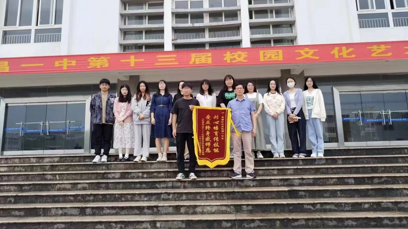 欢送会后,全体实习生将一面写有“精心培育传技能,受益终身感师恩”的锦旗送给了繁昌一中,以此来感谢繁昌一中领导老师对实习小组工作的支持,感谢指导老师们对实习小组的悉心指导。