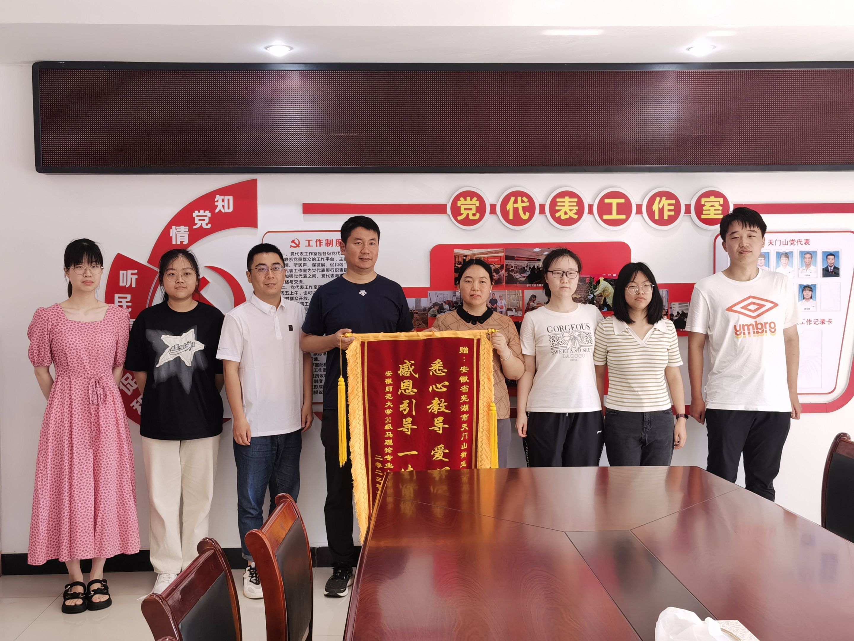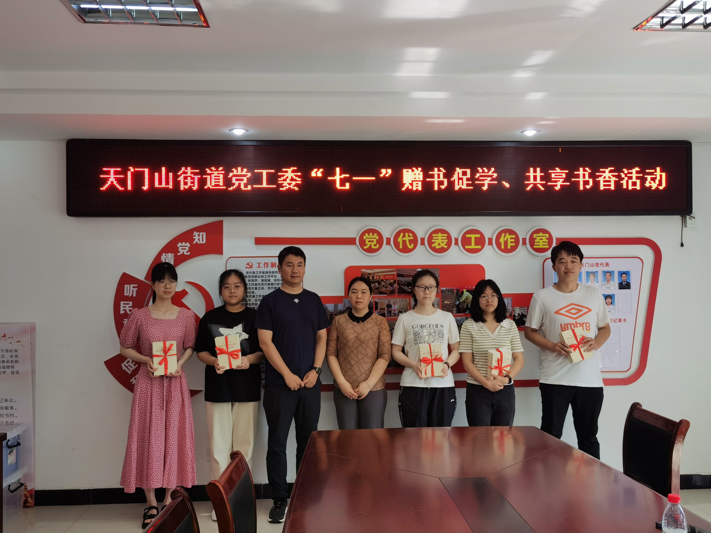 高艳杰老师带领5位实习生向天门山街道送锦旗以表达诚挚的感谢,员工代表傅祎譞发表实习期间的收获感言以及对街道的谢意。姜耀阳、许文龙代表街道接收锦旗并向实习生赠书。