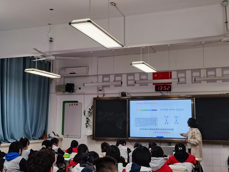 当日,实习生汪馨月于高一(16)班讲授《科学的世界观与方法论》,实习生王田、侯宇娇分别于高一(14)班、高一(17)班讲授《哲学的基本问题》。严宏老师实地察看了实习生的工作环境,与溧水高级中学的指导教师共同聆听了实习生的现场授课,并做详细记录。听课结束后,严宏老师与溧水高级中学李芮老师一道,与实习生进行亲切交流,了解教育实习的具体开展状况。