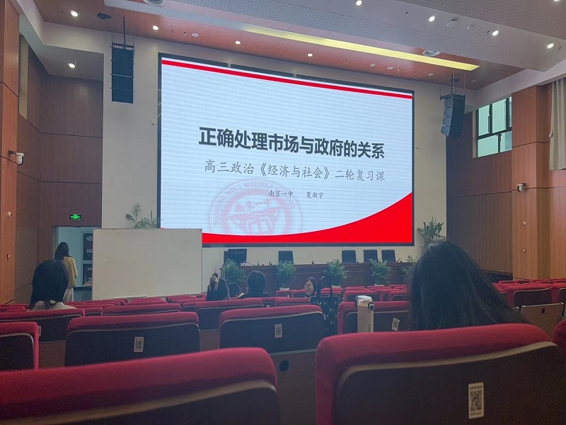 本次活动中,实习生们首先走进了南京市第一中学的夏新宇老师的一节高三政治《经济与社会》二轮复习课——《正确处理市场与政府的关系》,夏新宇老师从“识别有效市场与有为政府相结合的体现”“解码有效市场和有为政府相结合是有效的原因”和“探究提升有效市场与有为政府相结合的措施”三个任务,带领同学们对有效市场与有为政府的相关知识进行了精准复习与有效梳理。