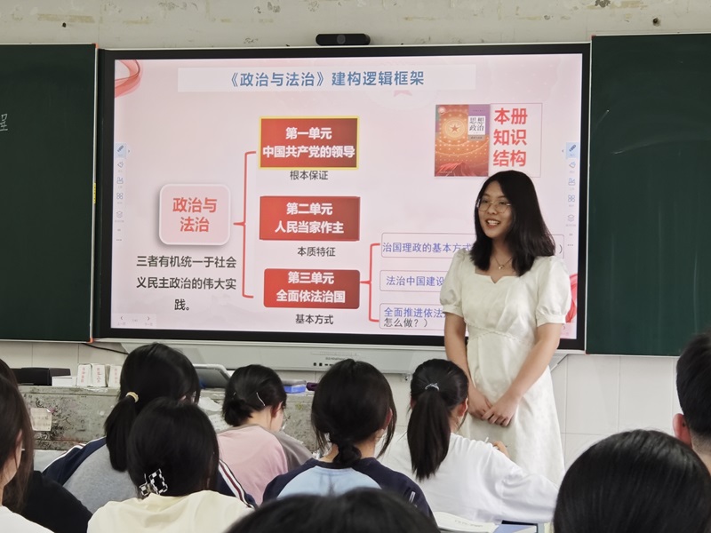 实习生文星蕾在高一(11)班讲授了《人民代表大会制度是我国的根本政治制度》;实习生吴晓薇、左阳、王彬力分别在高一(11)班、高一(13)班、高一(14)班讲授了《我国法治建设的历程》。王艳老师听取了四位实习生的现场授课,并做了详细记录。课后,王艳老师同实习生们在会议室总结听课感受,对实习生的表现进行集中点评,并对授课的不足之处给予指导意见。