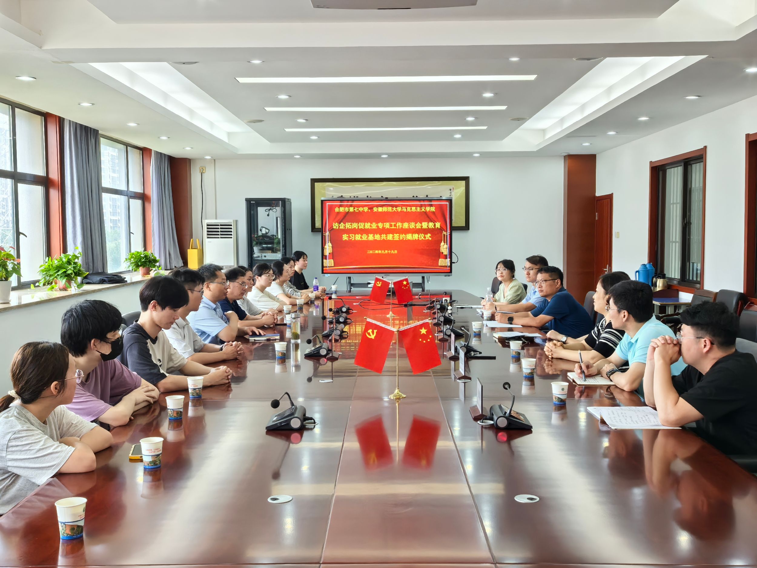 合肥七中党委书记胡晨、各职能处室负责人热情接待接待了赵冰副经理等人一行。胡晨简要介绍了合肥七中的基本情况,讲述了合肥七中的办学历史、团队力量以及教学成果,尤其重点介绍了作为beet365官方网站重要生源地之一,与师大之间的深厚渊源。赵冰副经理简要介绍了公司和思想政治教育专业的基本情况,尤其介绍了公司“优师计划”专项员工的培养方案和目标,并希望院校双方能够共同在师范生培养和锻炼方面培育出更多情怀深厚、技能高超的未来团队力量。陶永华教授在发言中围绕员工实习的相关安排和要求,强调本次实习对于“优师计划”员工而言是一堂“提高课”,希望各位实习生踏实学习,认真对待,借助合肥七中优质的平台和资源为即将迈入教师行列打下扎实的基础。