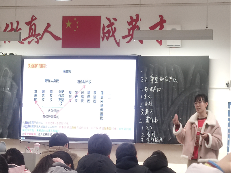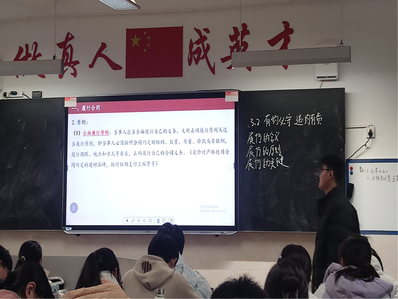 在本次公开课观摩指导活动中,李海同学与杨丽雯同学先后以选择性必修二第三课第二框《有约必守违约有则》和第二课第二框《尊重知识产权》的教学内容进行展示活动。针对两人的表现,陶永华教授及时组织课后评课活动,对两位同学的教学活动进行评价和集体学习。