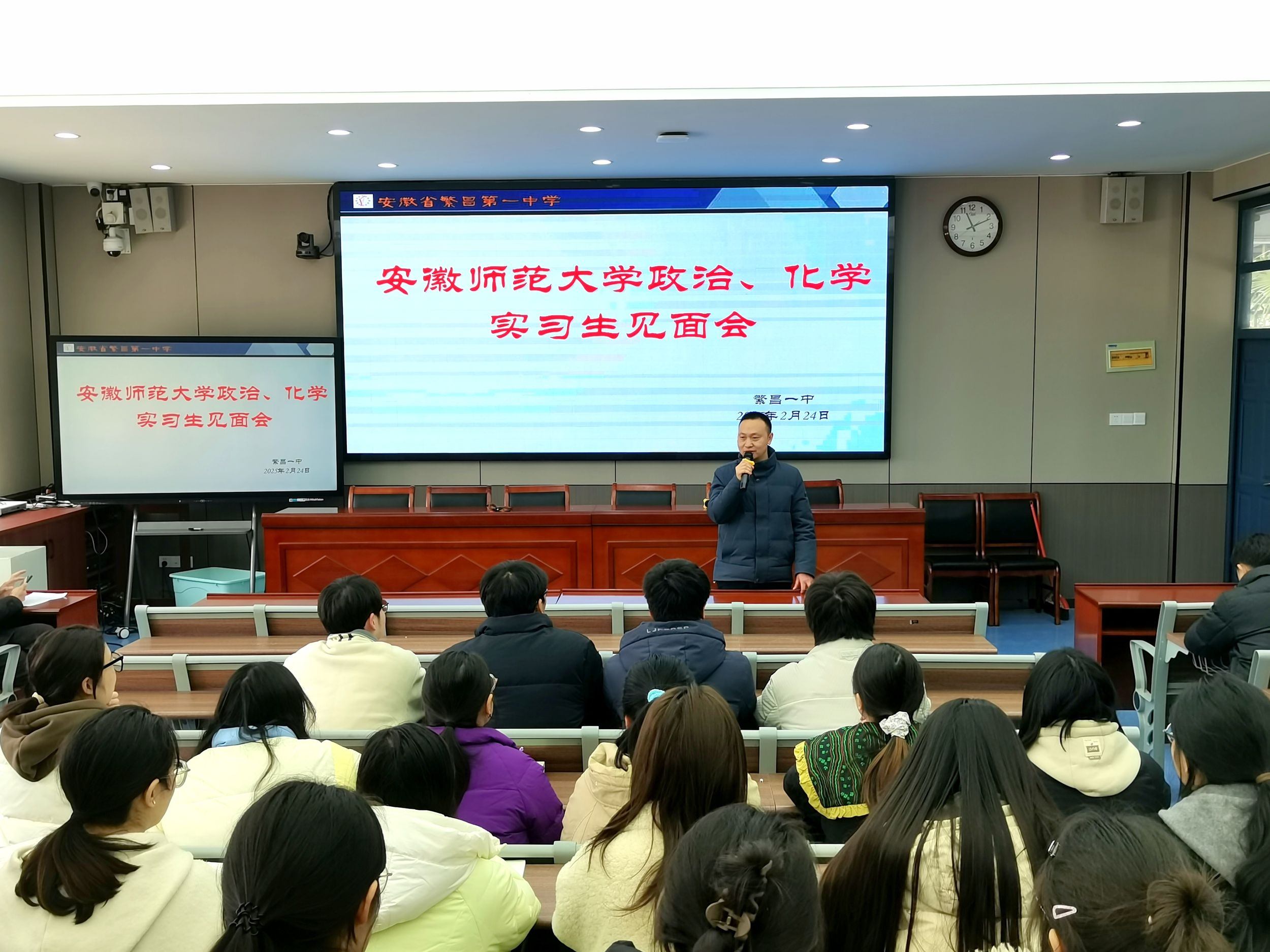 为深化教育实践育人成效,推进师范生专业能力与一线教学深度融合,2月24日上午,在公司指导教师王艳教授的带领下,2022级思想政治教育专业14名本科生走进芜湖市繁昌一中进行为期三个月的教育实习。上午10时,实习见面会在繁昌一中A阶教室举行,会议由教务主任佘敦群老师主持,繁昌一中教学董事长刘建、高一年级分管副董事长高娟娟、教务主任佘敦群、政治教研组指导老师曹俊武等和全体实习生共同参会。