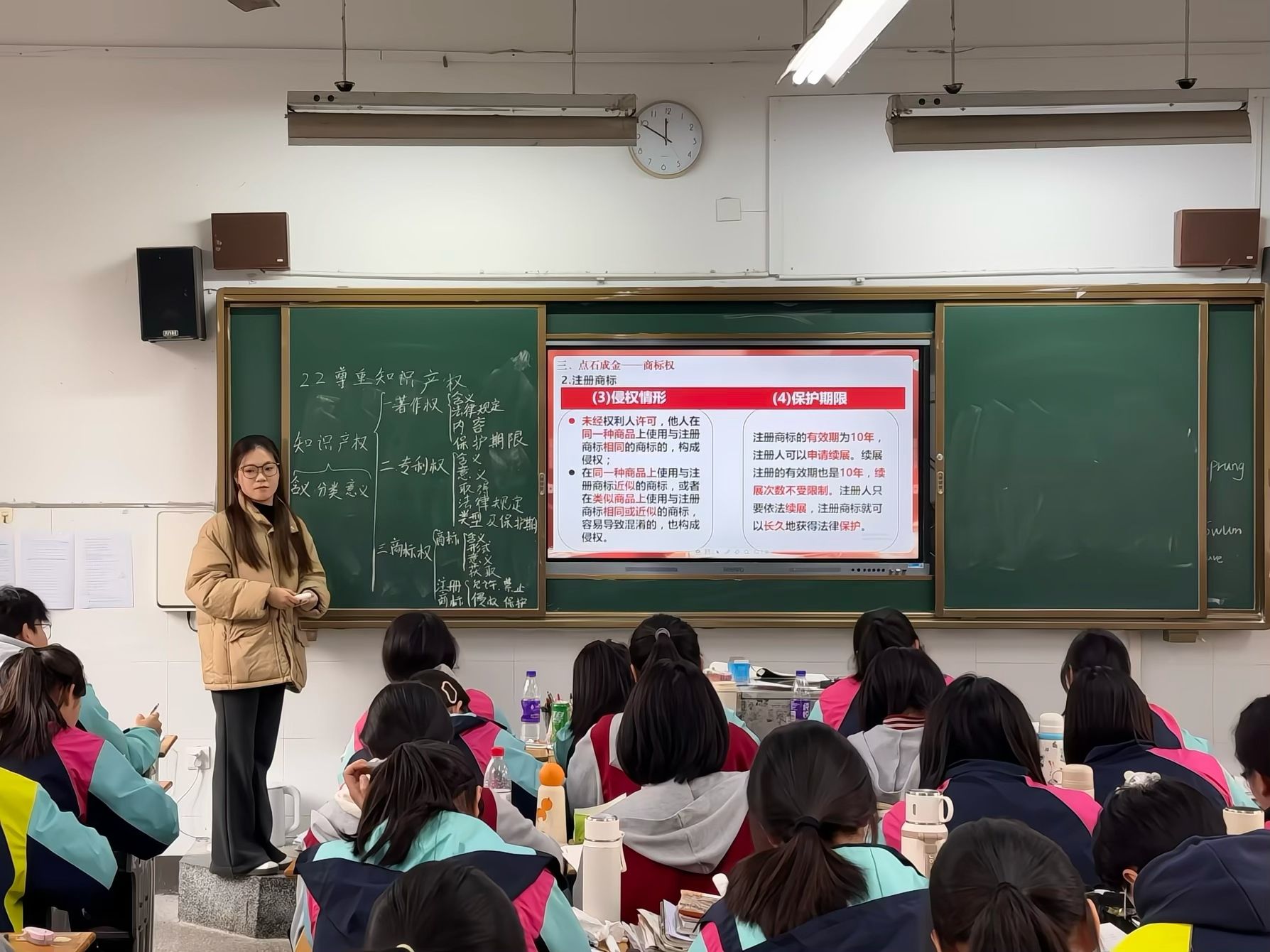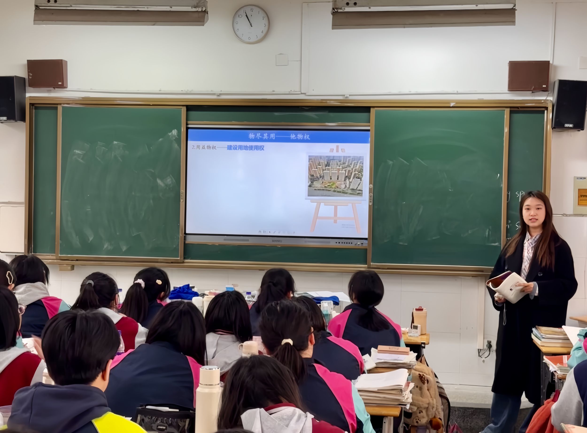 此次的教学实践环节,实习生们以饱满的热情和严谨的态度,围绕新课标要求,精心设计相关课程内容。赵焕炜紧跟时事热点,讲授《尊重知识产权》相关课程。胡夏如联系生活实际,以“房产纠纷”为教学情境,展开《保障各类物权》的课程教学。