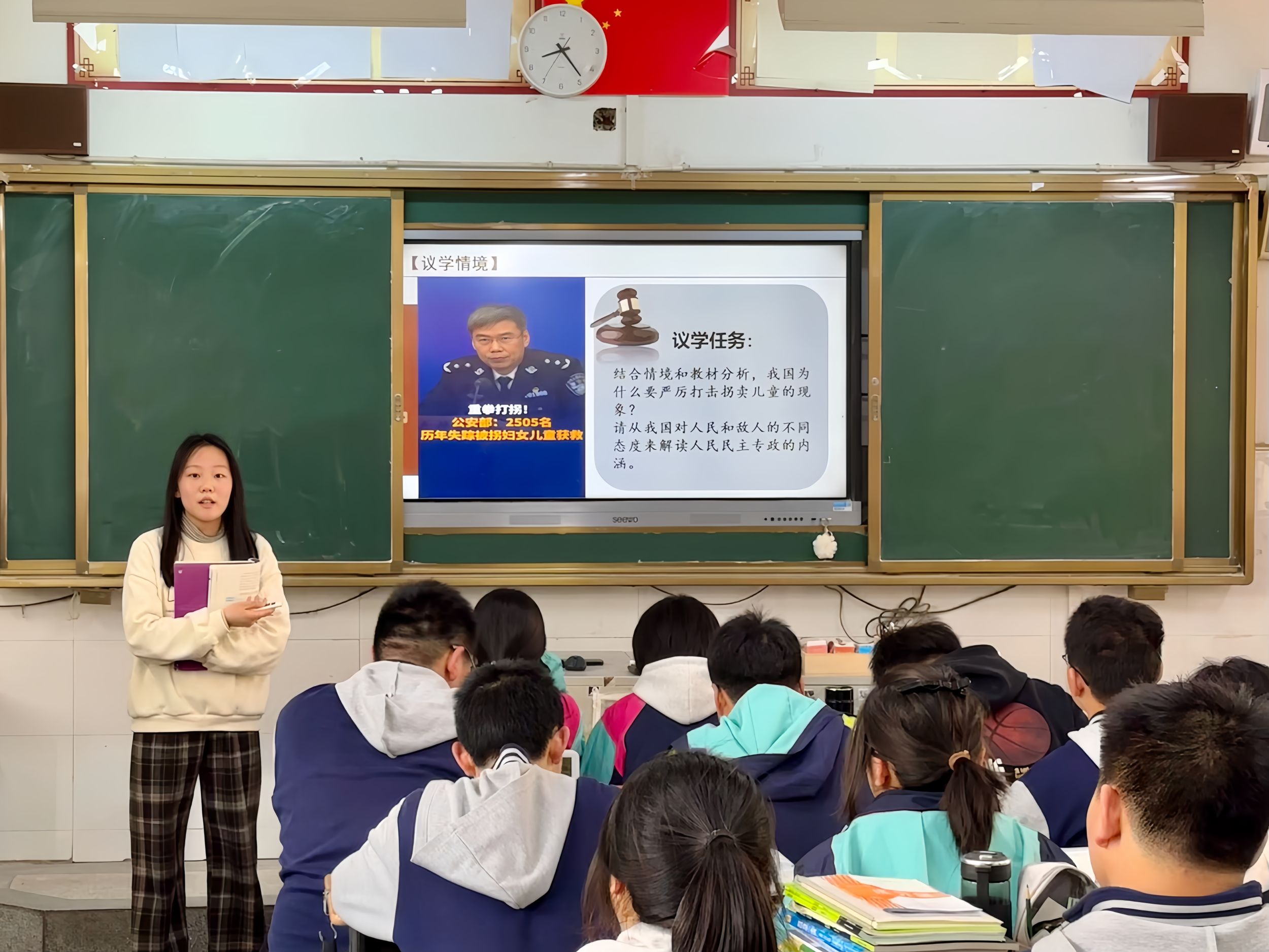相满意、陈小丽和沈满三位实习生围绕《坚持人民民主专政》,聚焦大概念统摄下的单元教学设计,集体备课、反复打磨,开展同课异构教学实践活动,实施差异化课堂展示。王东老师、高一政治备课组组长吴倩云老师共同观摩现场授课。