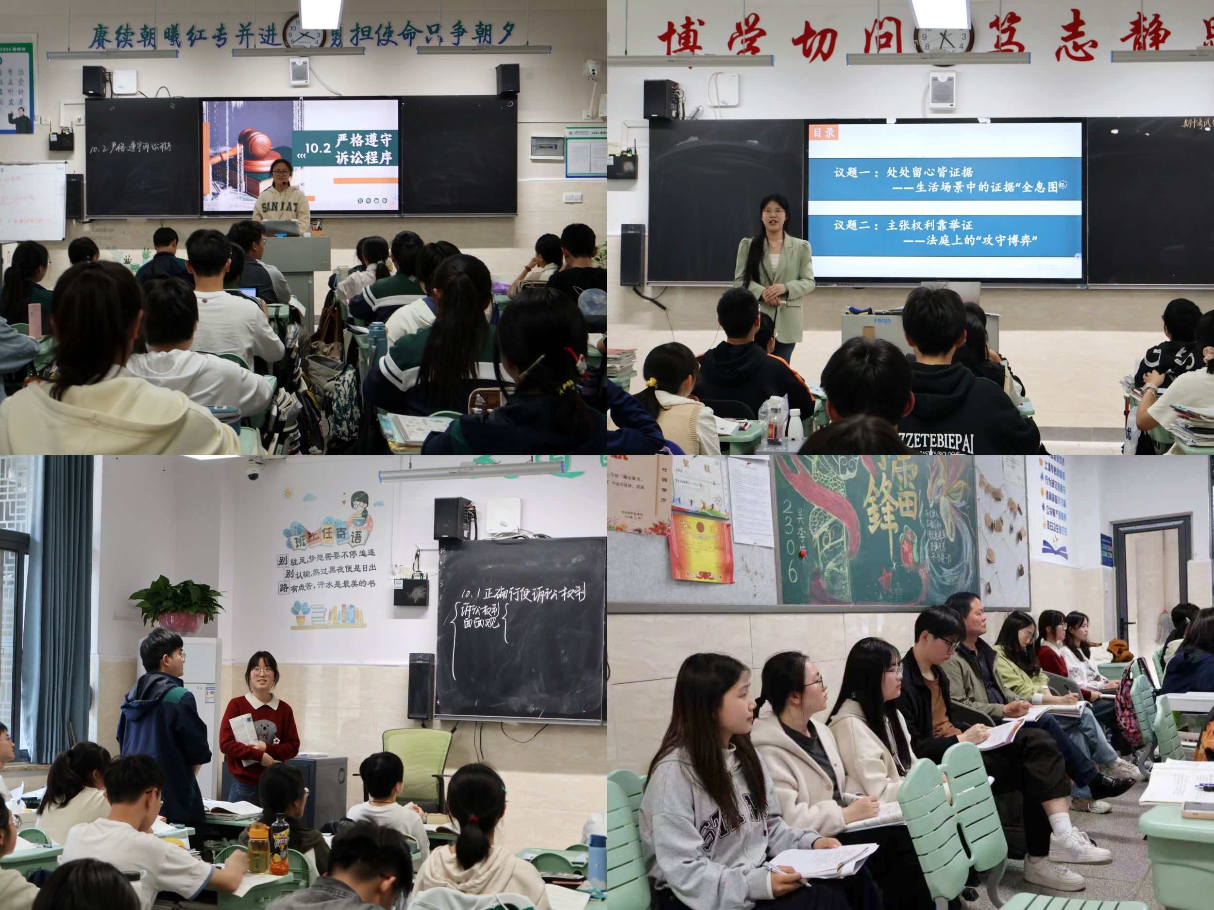 课堂教学中,三位实习生采用大单元教学模式,围绕选择性必修二《法律与生活》第十课展开教学实践。其中,方怡在高二(8)班讲授《正确行使诉讼权利》,陈巧在高二(4)班讲授《严格遵守诉讼程序》,徐益佳在高二(6)班讲授《依法收集运用证据》。高二政治组全体教师及实习生全程观摩,并作详细记录。