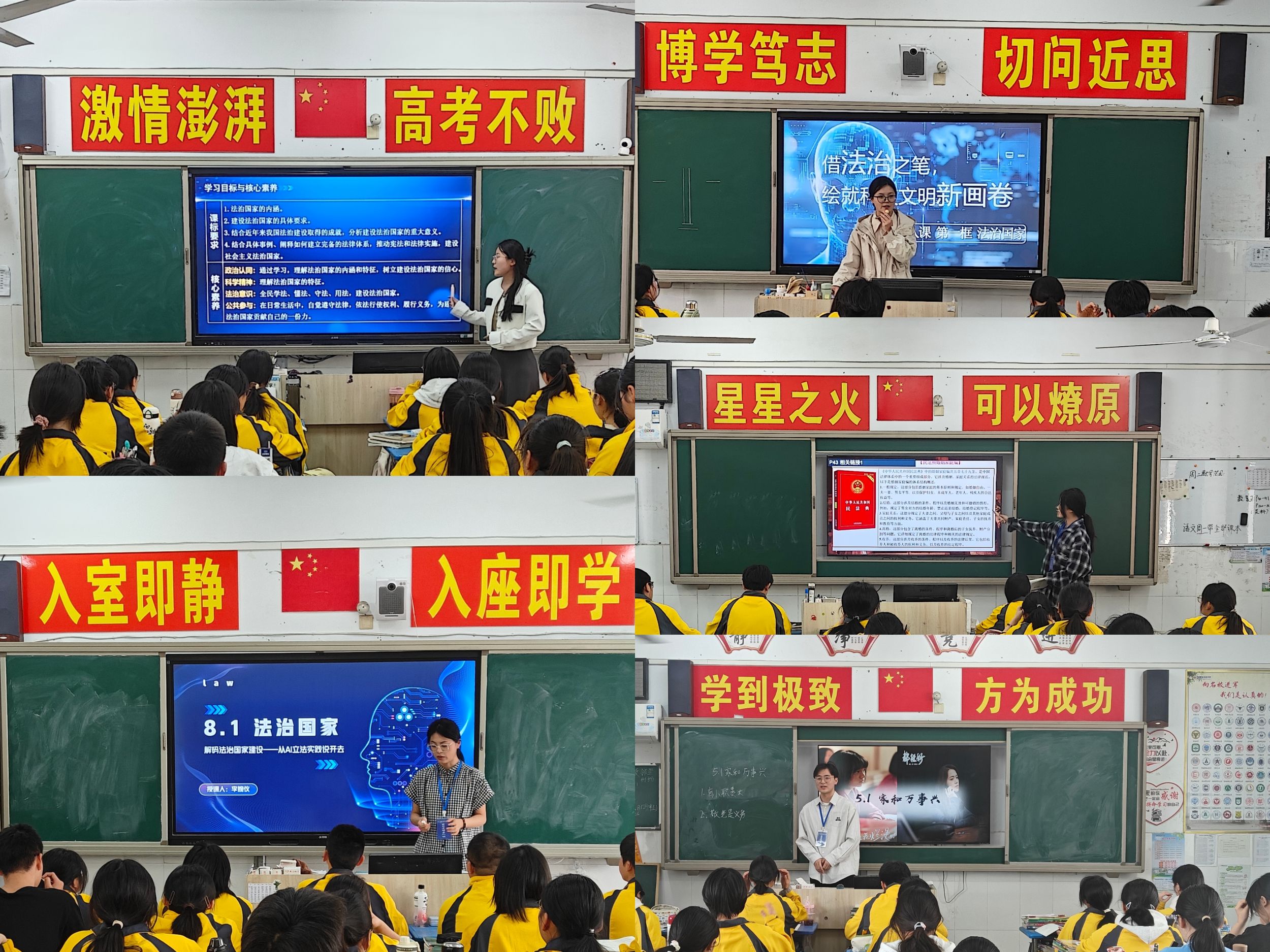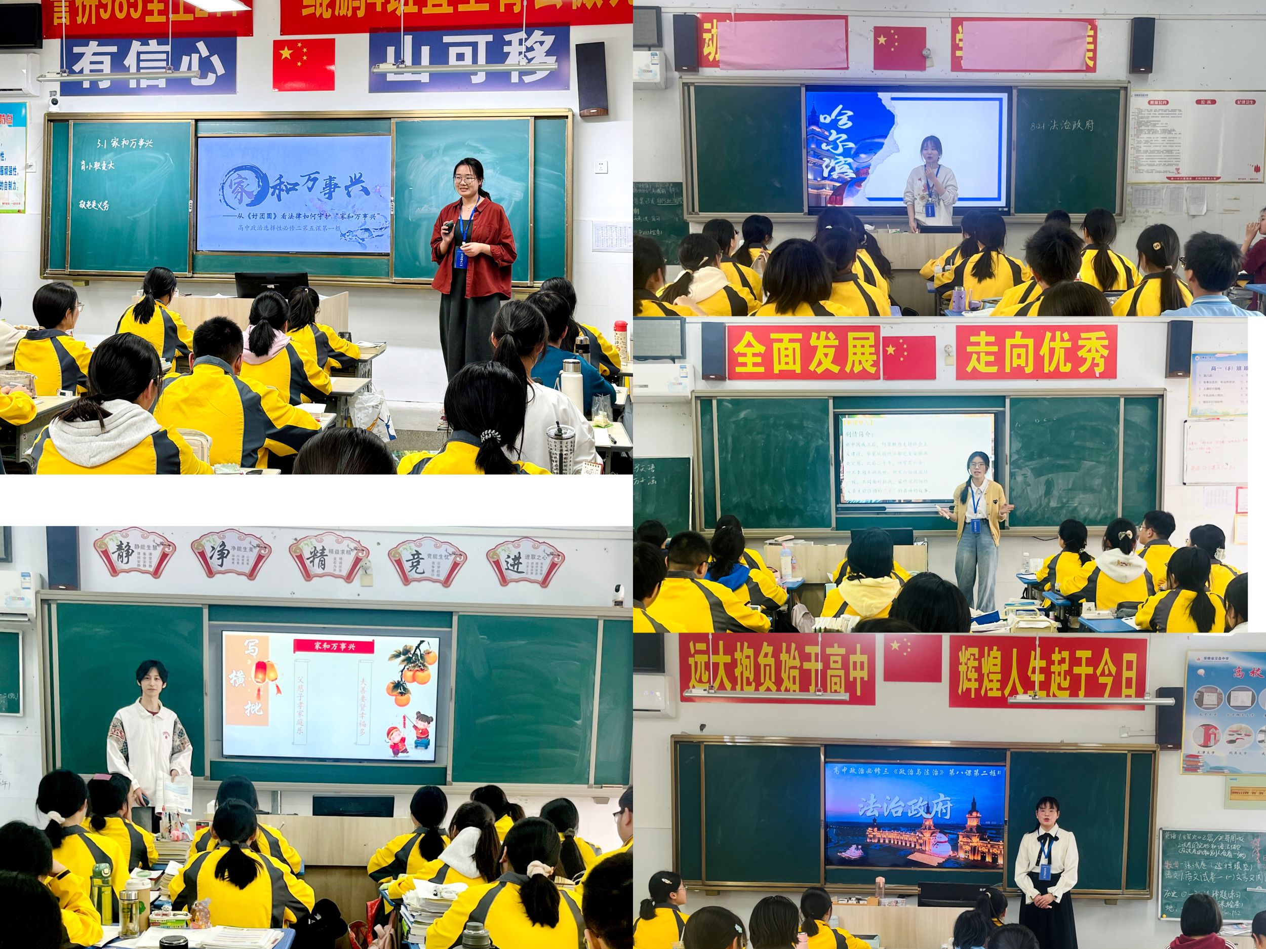 实习生们非常珍惜本次机会,采取同课异构的方式,充分展现了自己的教学基本功。丁妍、胡文政、俞浩、徐琳和郑美琪分别在各自班级围绕《家和万事兴》开展课堂教学,李婉仪、何莉莎和罗雯分别在各自班级讲授《法治国家》相关课程,高文君、李康美围绕《法治政府》展开教学,全体师生旁听。