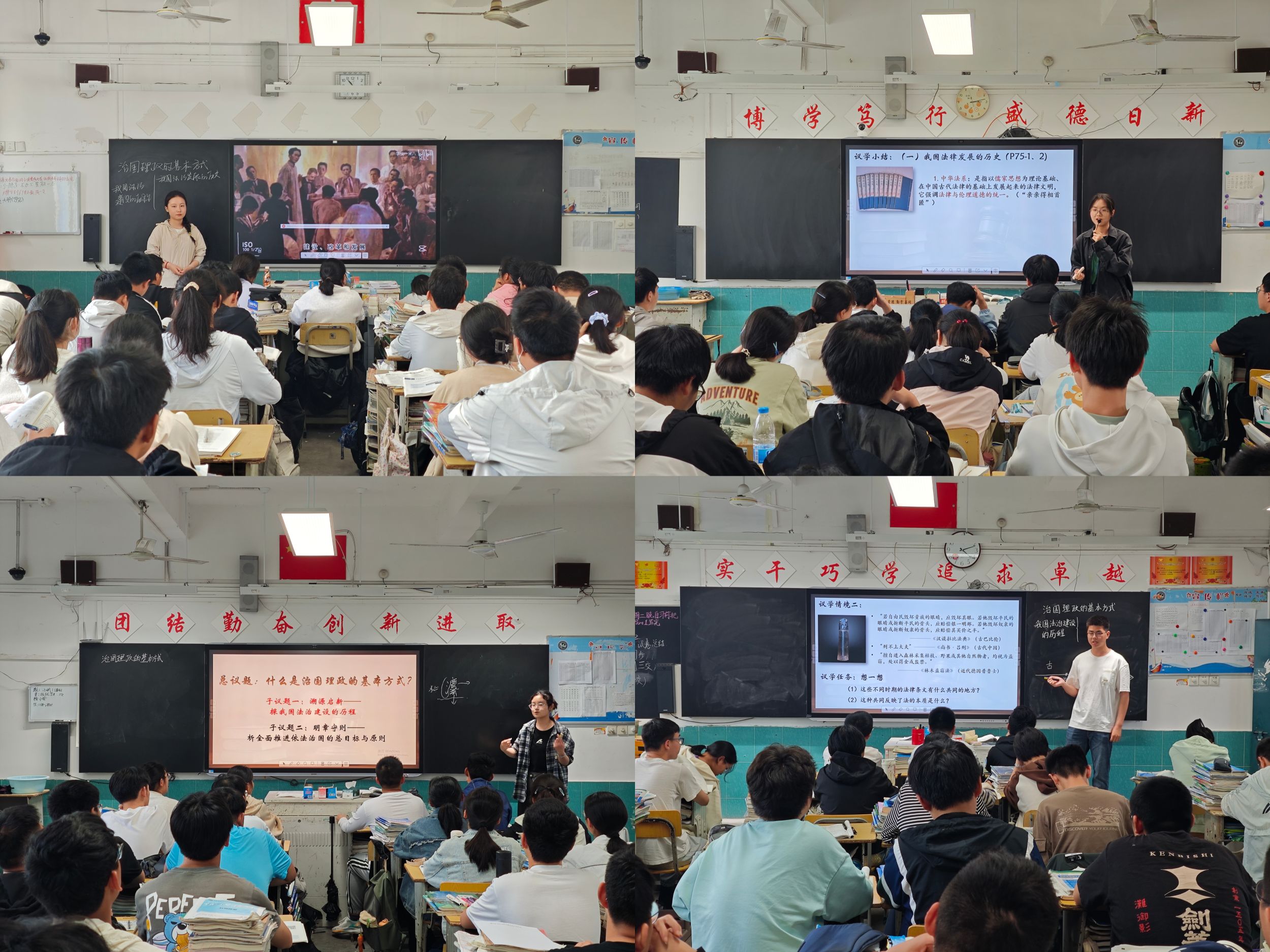 在课堂教学展示环节,实习生刘书蕾、武小蝶、张少杰和周于皓四位同学采用“同课异构”的方式,在各自班级讲授《治国理政的基本方式》。各位实习生立足新课标要求,结合自身教学风格,呈现了各具特色的精彩课堂。其中,刘书蕾同学运用图画式板书串联知识点,武小蝶同学通过生动讲解增强课堂互动,张少杰同学以案例分析激发思维碰撞,周于皓同学则采用历史线路构建知识体系,充分展现了扎实的专业功底和良好的教学素养。