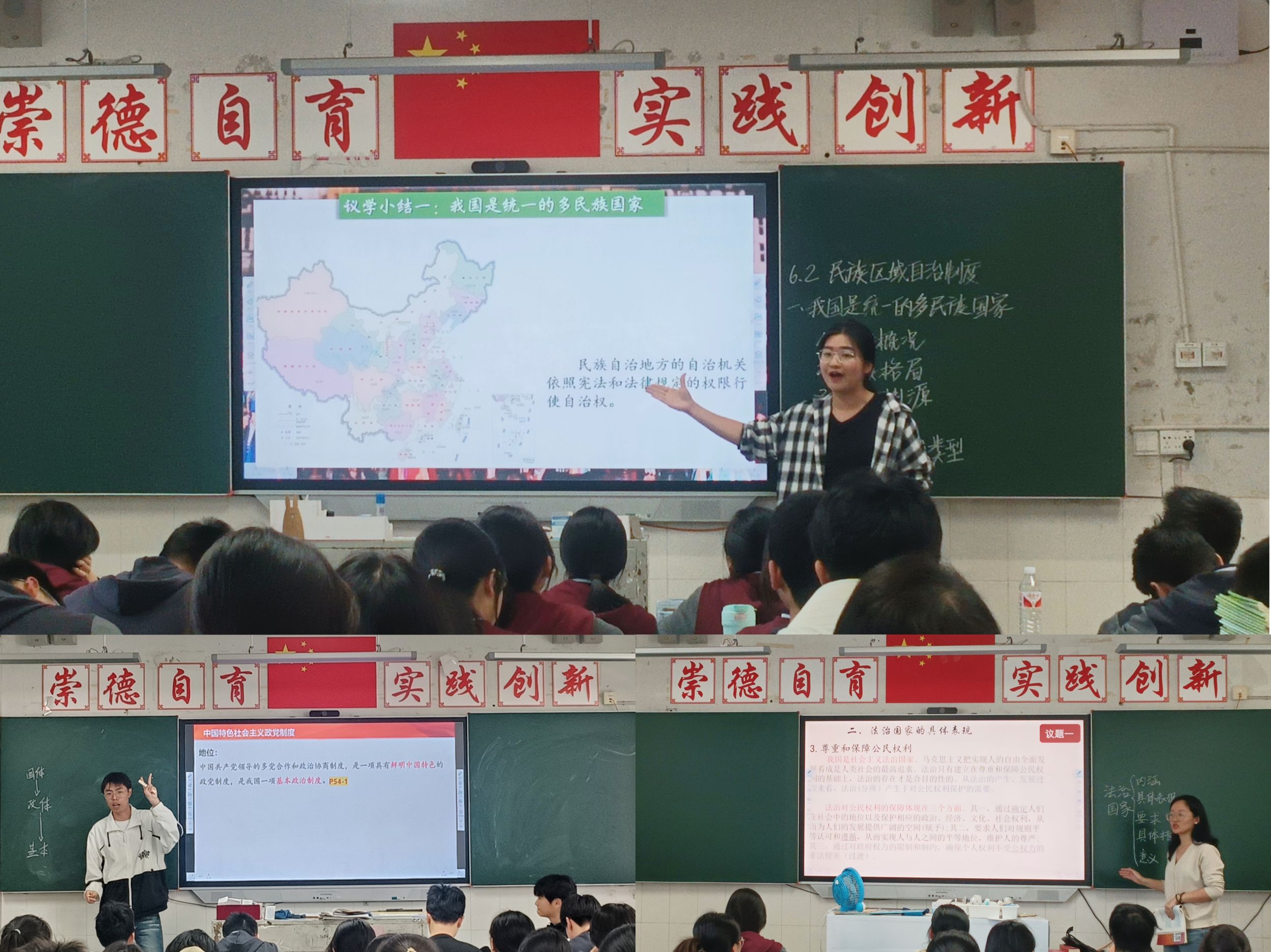 实习生蒲少华、罗宇涵、胡蛟分别在各自班级开展授课。三位实习生立足新课标要求,采取同课异构的方式,围绕《我国的基本政治制度》呈现了各具特色的政治课堂,仰永忠老师先后听取了三位实习生的现场授课。