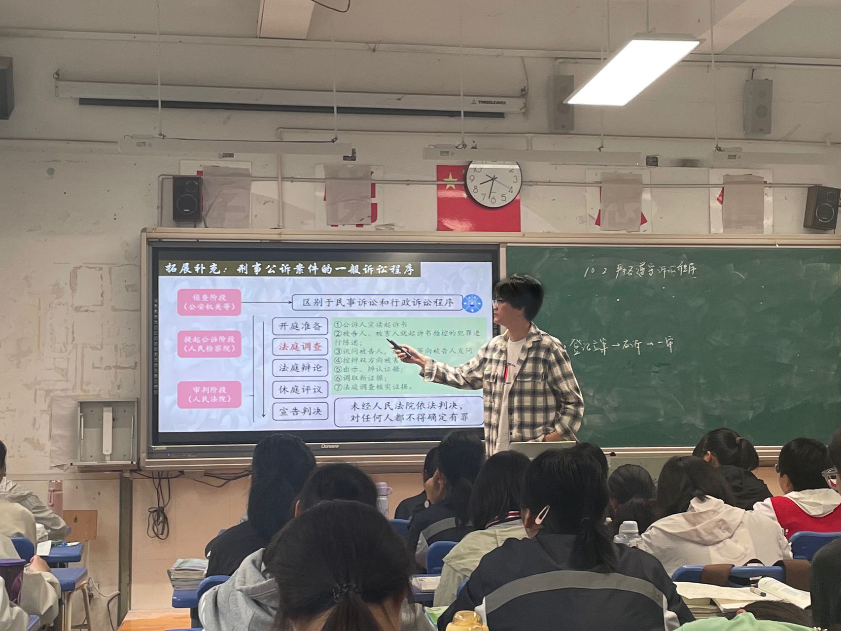 课上石思远同学讲授《严格遵守诉讼程序》内容。石思远以社会热点案例导入,用清晰的流程图梳理诉讼流程要点,课堂氛围活跃。