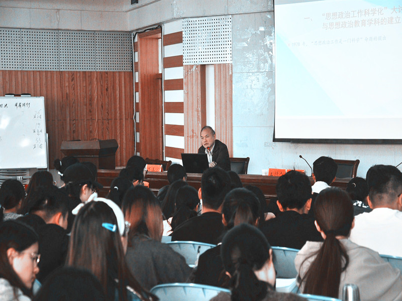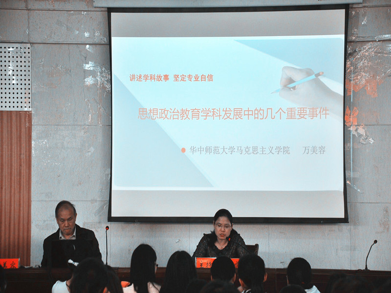 万美容教授以公司思想政治教育学科创建为例引入主题,分别向同学们介绍了思想政治教育学科的创建经过、发展变化以及马克思主义理论一级学科的设立等内容。随后,万美容教授结合自己由生物学专业转而研究思想政治教育专业的经历阐述了思想政治教育学科人才培养的重要性。在新的历史条件下,随着社会主义市场经济体制的建立,思想政治教育学科发生了新的变化,多所高校申请建设思想政治教育学科博士点,百家争鸣,百花齐放。接着,万美容教授强调要加强和改进青少年思想政治教育,重视马克思主义理论一级学科与思想政治教育学科的创新发展。他表示新时代国家重视思想政治教育学科的新发展,通过召开公司思想政治理论课教师座谈会发挥思想政治教育立德树人作用。最后,万美容教授强调思想政治教育学科发展前途光明,并激励思政学子不懈努力、认真钻研。