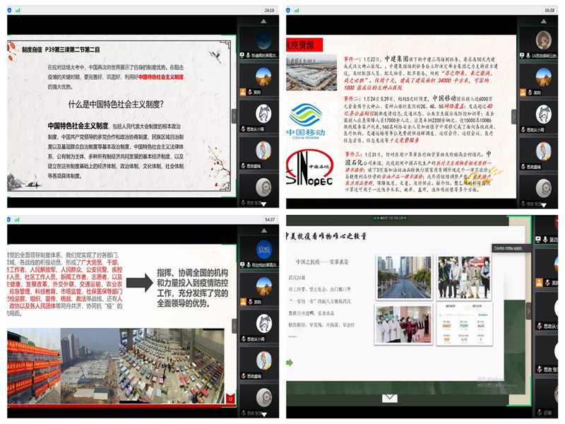 首先,陶永华简要介绍了开展此次活动的目的。疫情防控期间涌现的素材,可以转化为深刻而鲜活的教材,供思政课教学所运用。随后,四组同学分别就2019年新版高中政治教材中的重要内容,结合搜集的资料进行了一次生动的思政理论课汇报。第一组同学分别从四个自信、新时代青年人、党的自我革命、人类命运共同体四个角度展开,联系火神山医院建设、抗疫一线医生的事迹、中国对外援助其他国家抗疫等事实讲解《中国特色社会主义》。第二组同学以《经济与社会》第一单元基本经济制度与经济体制为中心,具体阐述我国的基本经济制度和我国的社会主义市场经济体制的基本原理。第三组汇报《政治与法治》的同学将党中央关于疫情防控的重大决策部署、生命至上人民至上的科学防控依法防控等现实案例融入思政课,从中国共产党的先进性、坚持和加强党的全面领导、我国的根本政治制度、我国的基本政治制度、全面依法治国五个方面进行理论解读。第四组同学运用马克思主义的世界观和方法论,深耕教材《哲学与文化》,找准“抗疫”故事与教材内容的结合点,以透彻的学理性分析事例。最后,陶永华对每组汇报进行点评,肯定了同学们优秀的表现,同时表明课程改革要求思政课教师做到情境化教学设计,创设情境离不开课程资源的支撑,同学们要利用好疫情中的事例与素材,与学科教学有机融合,努力化解疫情危机为教育契机。