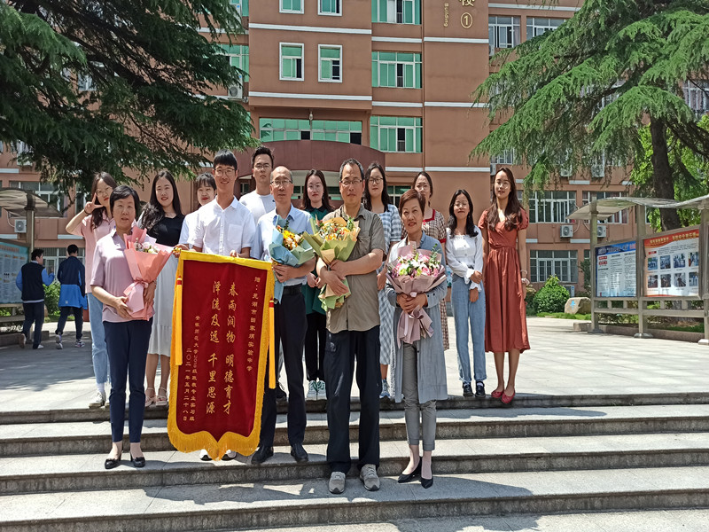 仪式开始,全体实习小组同学向芜湖市田家炳实验中学高一政治组三名老师献上了鲜花、礼品和一面写有“春雨润物、明德育才。泽流及远、千里思源”字样的锦旗,感谢田家炳实验中学指导老师这两个月对实习生的谆谆教导与支持。随后,高一政治组三名指导老师充分肯定了实习生勤恳负责的工作态度和优秀的师范生技能,指出学习是相互的也是永无止境的,他们很高兴结识了年轻的老员工,通过听实习生的课也学习到了很多新东西,并寄语实习生要不断加强自身专业知识与技能的学习,把握机遇,取得更大的进步!最后,实习小组成员两两一组,也为自己的班主任指导老师送去了鲜花和感谢,感谢他们在一个月班主任实习工作中对实习生的指导与帮助,并进行了合影留念。