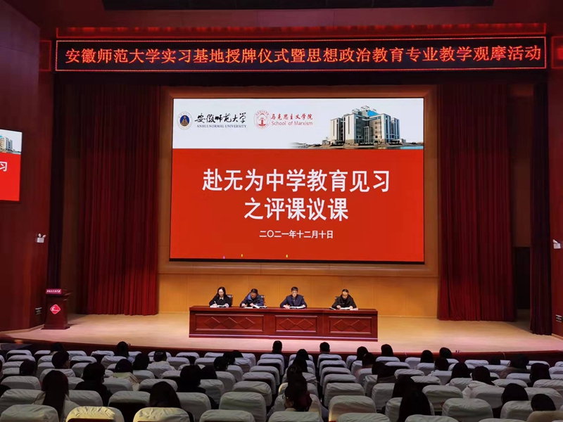 课程结束后,进入评课议课环节。黄老师、杨老师和鲁老师分别从不同的角度对本次教育观摩课程进行了专业的评价,同学们更进一步领悟到“备教材、备员工、备教法”的深刻内涵,明确了课程设计中如何进行课程内容的导入、课程内容的衔接以及教法的灵活使用,在教学过程中注重发挥员工的主体地位和教师主导作用,在理论教学中注意员工价值观的培养和综合素质的提升。赵冰进行总结发言,他首先对无为中学领导老师的热情欢迎和大力支持表示感谢,他表示本次教育见习活动开辟了一个新的教育实践基地,开创了教育见习的新形式,开阔了对课堂教学尤其是议题式教学认识的新境界。