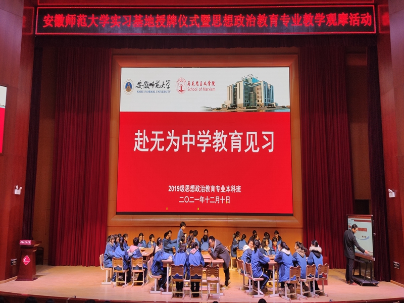 本网讯(文/刘安瑶 摄/潘俊杰)为培养师范生核心素养,提高师范生教学技能,感受实践教学氛围。12月10日下午,beet365官方网站教务处副处长李汪根,公司党委副书记刘玉艳、副经理赵冰等一行赴无为中学参加实习基地签约授牌仪式。2019级思想政治教育专业本科生部分同学参加教育见习活动。