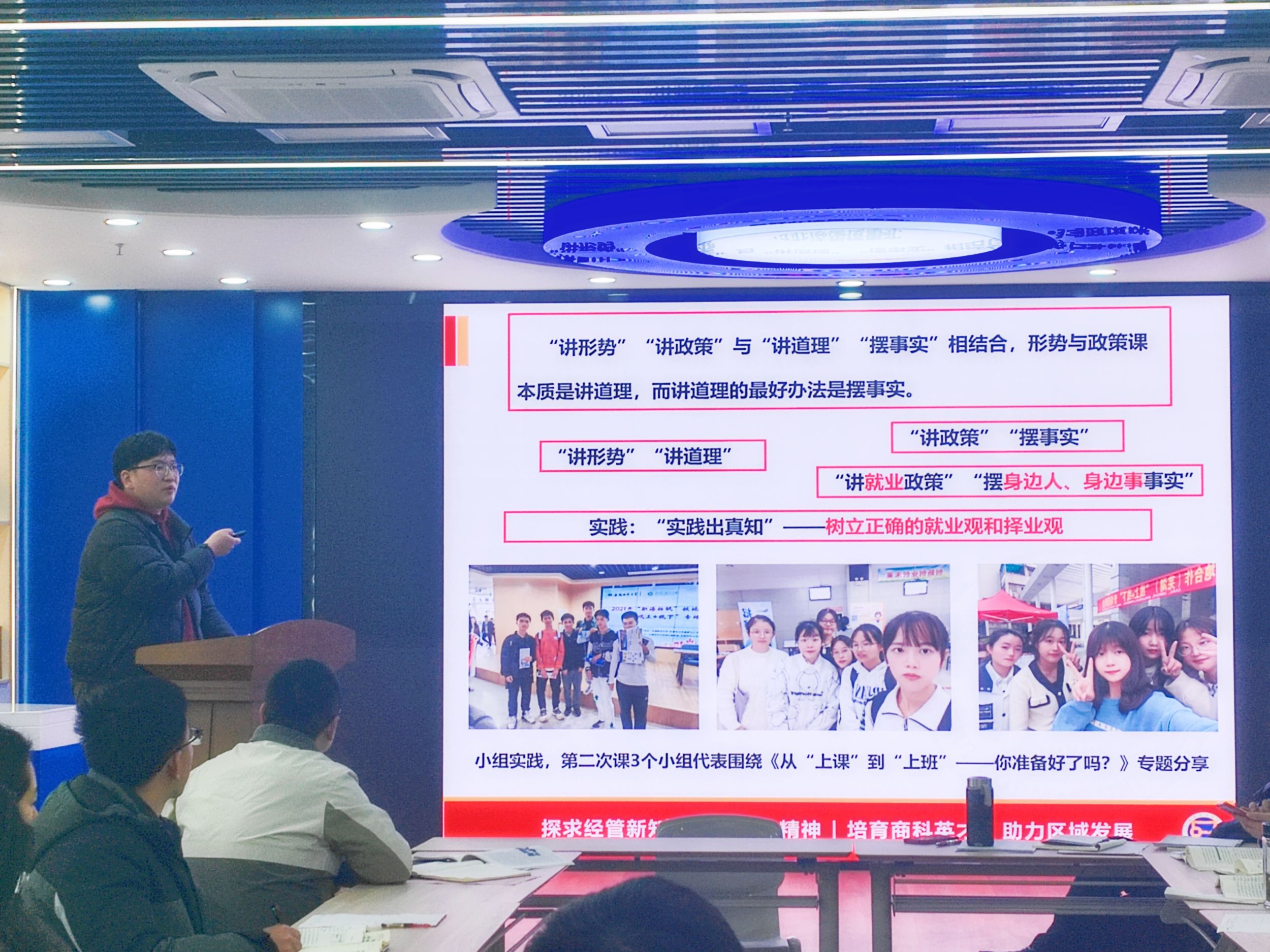 会上,公司党委宣传部理论教育科科长张春光领学传达《新时代高校思想政治理论课教师行为规范和准则》精神。他表示,全体专兼职思政课老师,都应该坚持以习近平新时代中国特色社会主义思想为指引,增强政治意识,加强作风建设,树立良好的师德意识,努力做好育人工作。教育科学公司专职辅导员莫大贡,经济管理公司团委书记、专职辅导员吕洋分别《读懂中国式现代化》《当前就业形势与实施就业优先战略》等最新专题课程,进行了精彩的教学展示和教法研讨。两位青年教师代表教材讲解透彻、教具准备齐全、教学状态饱满,充分展现了扎实的理论阐释功底、生动的教学教法技能和浓厚的立德树人情怀,赢得了全体教学团队的一致好评。张鑫围绕本学期“形势与政策”教学安排、课程内容、教学形式、考核方式等方面进行了专题汇报。