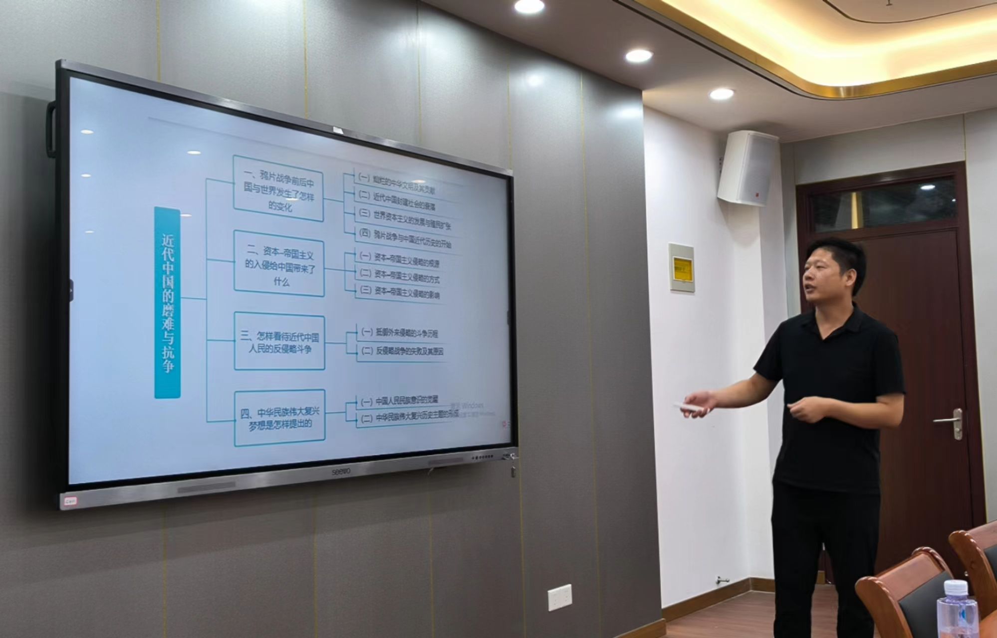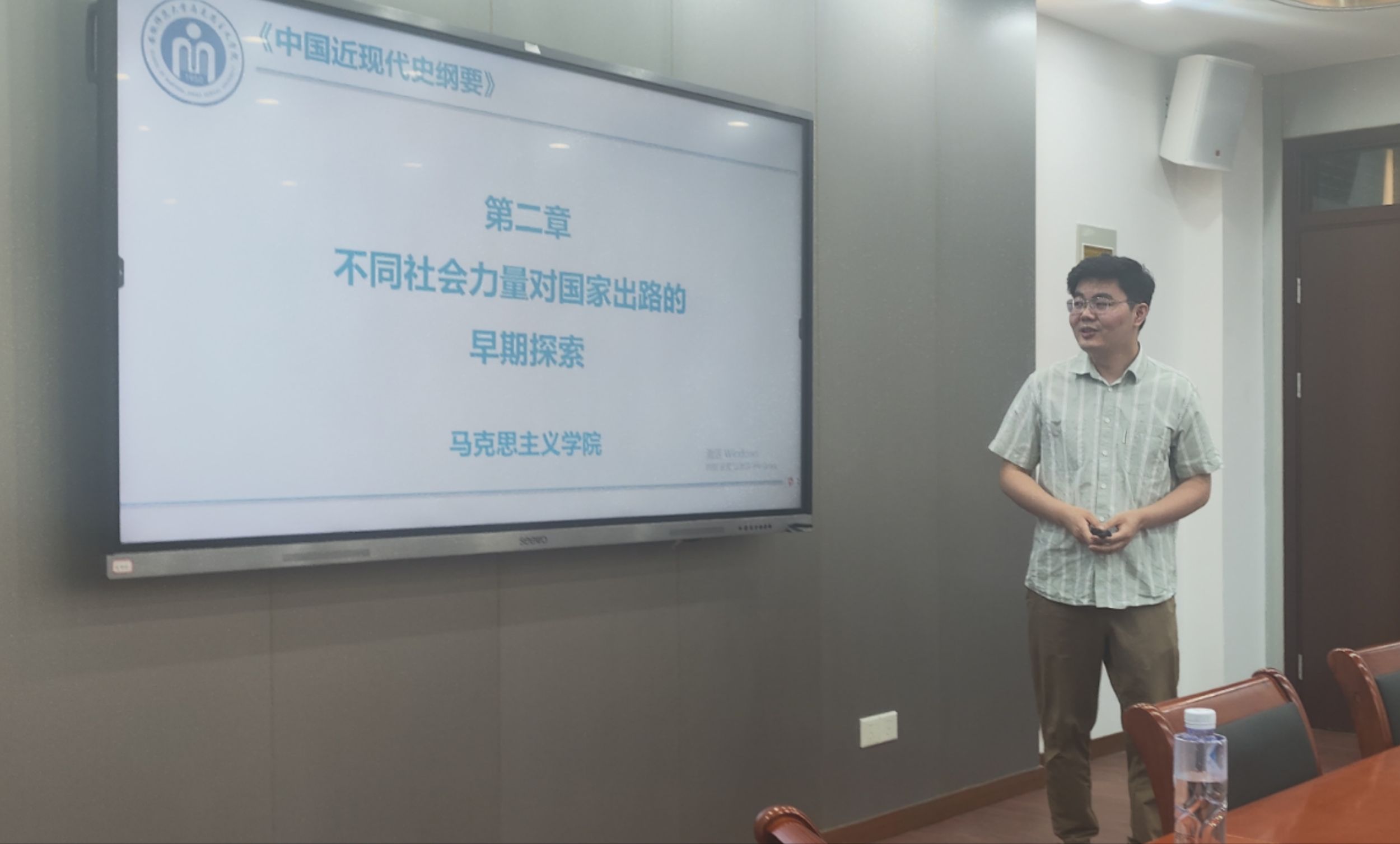 在备课会分享环节,魏正山老师、刘东老师和王勇刚老师分别进行了备课分享。魏正山老师围绕开篇《导言》部分,介绍了开设“纲要”课的重要意义、学习“纲要”课的目的和建议、“纲要”课的教学体系等,并着重分析了中国近现代社会历史的分期和发展脉络、中国近现代史的主题主线和主流本质等重要问题。刘东老师围绕第一章《进入近代后中华民族的磨难和抗争》的重难点,通过分析鸦片战争前后的国内外时局,系统阐述了近代中国贫困落后的根本原因,重点介绍了近代中国反侵略战争失败的原因和民族觉醒。王勇刚老师就如何上好第二章《不同社会力量对国家出路的早期探索》进行了备课分享,重点分析了近代中国农民阶级、地主阶级和资产阶级维新派对国家出路探索失败的原因和教训。各位老师授课内容准确、课程体系完整、教学素材丰富、教学过程流畅,得到与会老师的一致肯定。