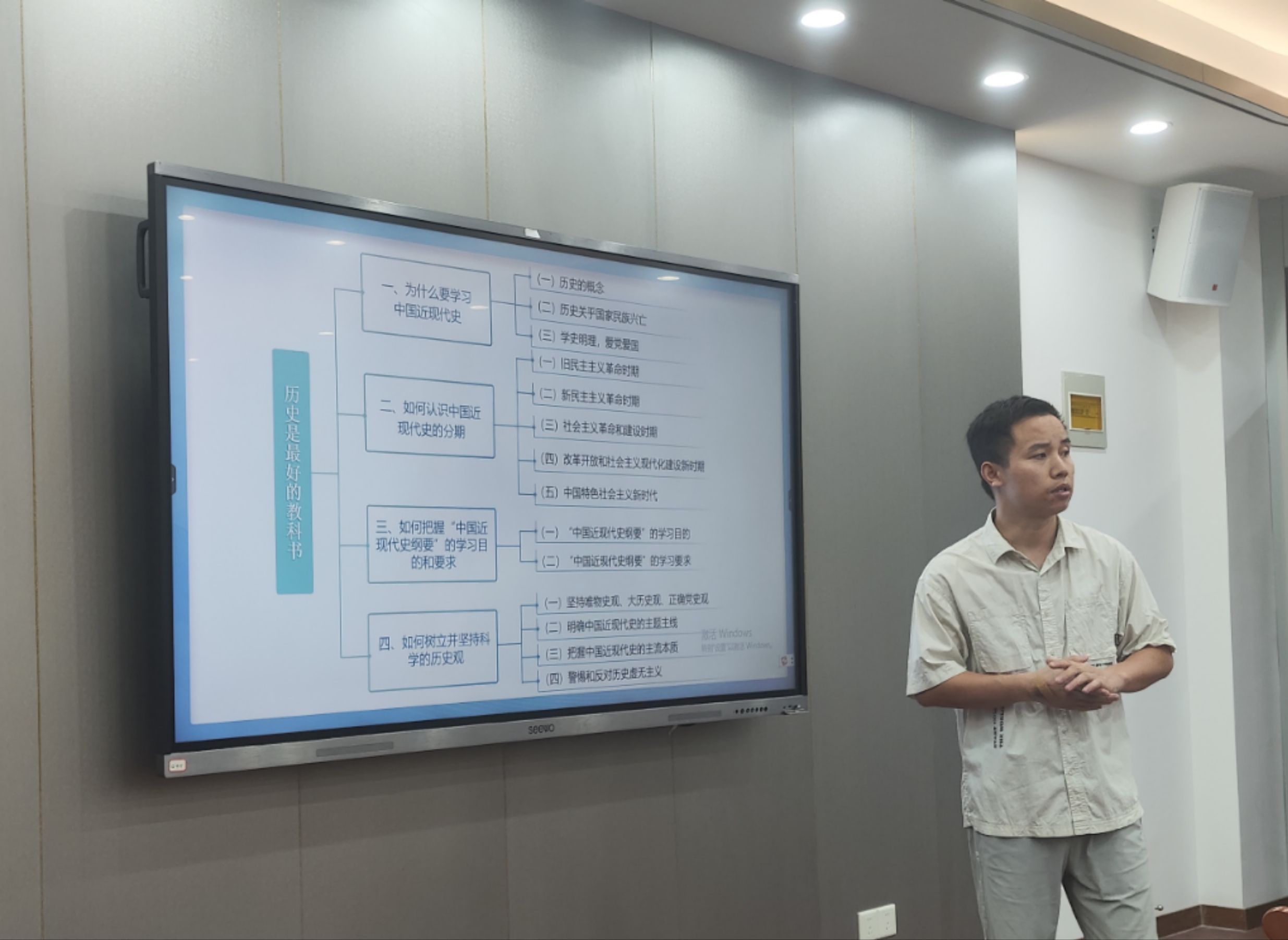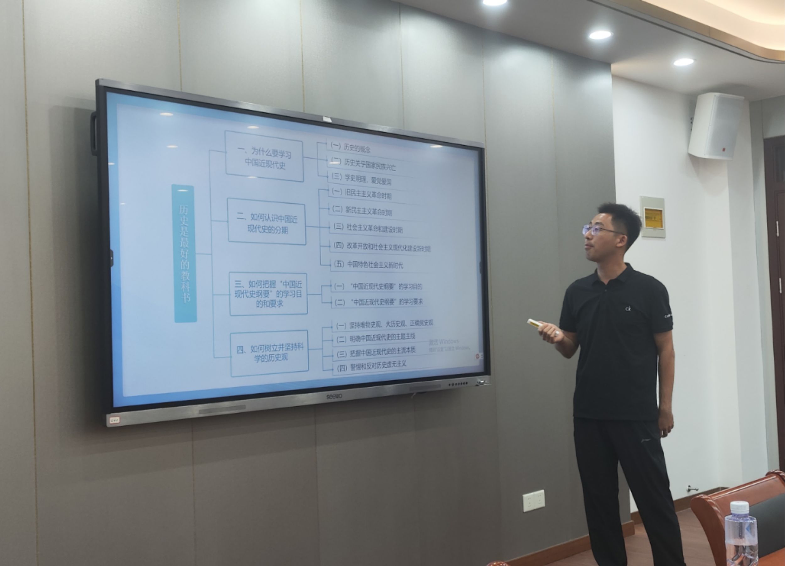 在新学期“第一课”试讲环节,课程组新任教师潘二亮、欧明容先后围绕2023年版《中国近现代史纲要》教材的“导言”部分进行了15分钟的试讲。潘二亮老师就如何上好“纲要”课,基于教材基本内容进行了教学展示,构思新颖,脉络清晰。欧明容老师围绕“导言”的主要内容,对教学目标、教学重难点、教学思路等问题进行了系统阐述,并就“第一课”如何巧妙导入等环节介绍了自己的独特心得。
