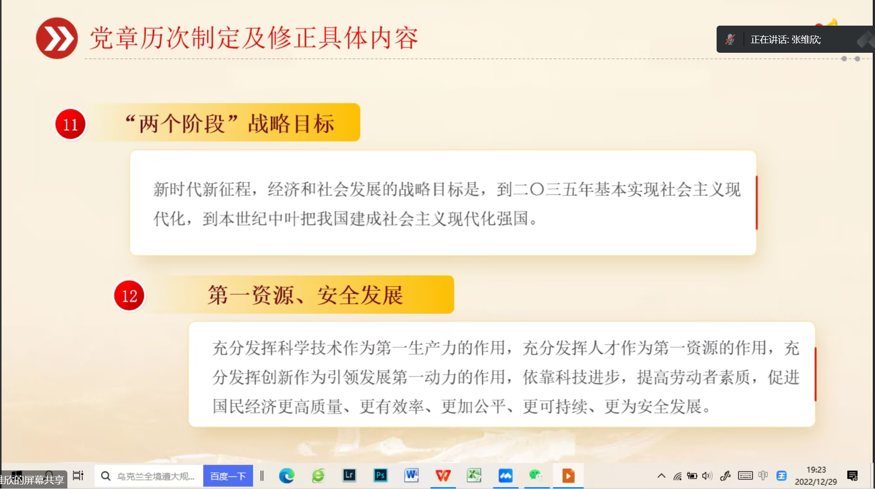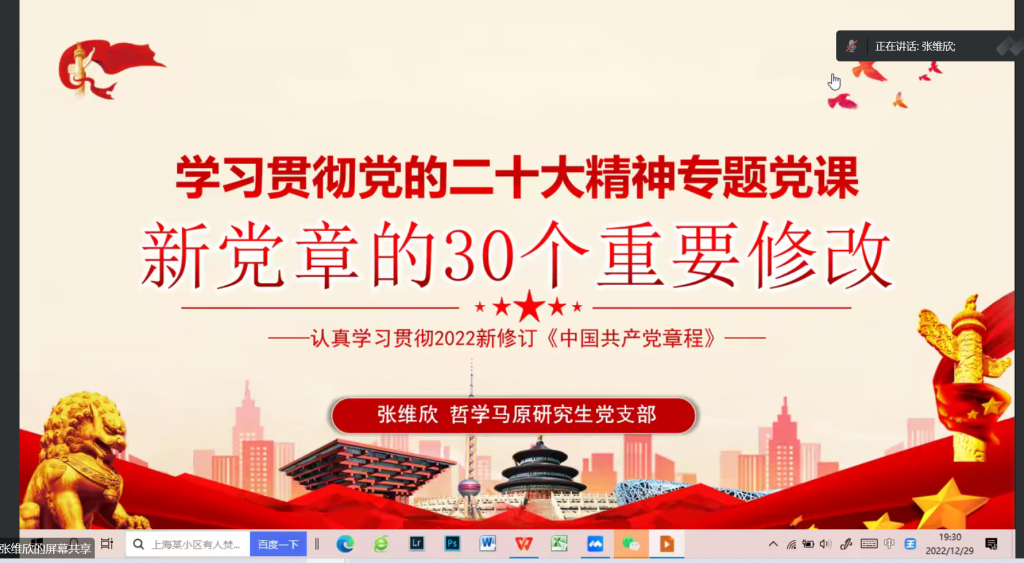 12月29日晚,beet365哲学马原研究生党支部通过腾讯会议开展题为“新党章的30个重要修改”党课学习活动。此次主题党课由支部书记张维欣担任主讲,支部全体党员同志参加。