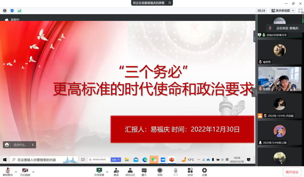 12月30日晚,马中化研究生党支部在线上开展以“‘三个务必’——更高标准的时代使命和政治要求”为主题的党课学习活动。此次活动由支部书记易福庆主讲,支部内全体党员同志参加。