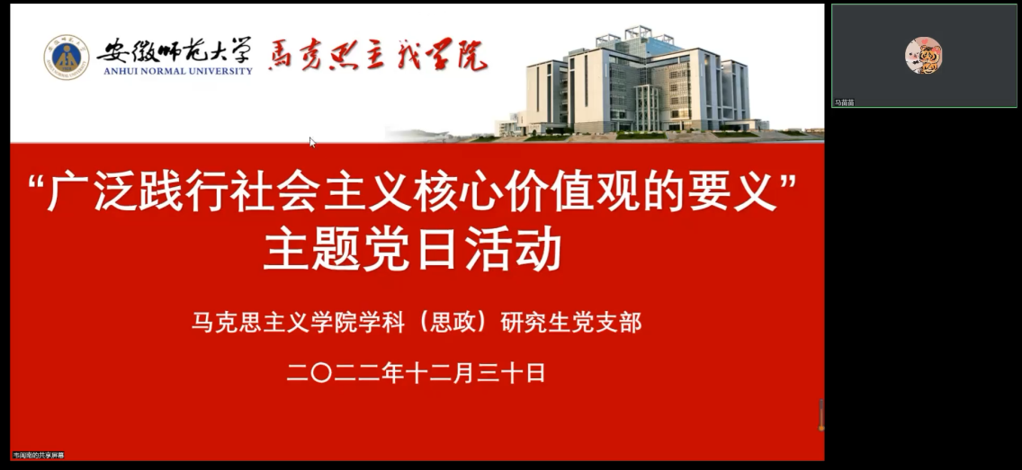 为了进一步学习宣传贯彻党的二十大精神,12月30日晚,学科(思政)研究生党支部在线上开展了“广泛践行社会主义核心价值观的要义”主题党日活动,本次党日活动由支部组织委员马苗苗主持,支部全体党员参加。
